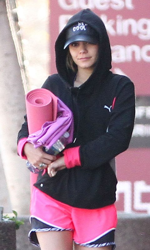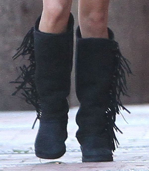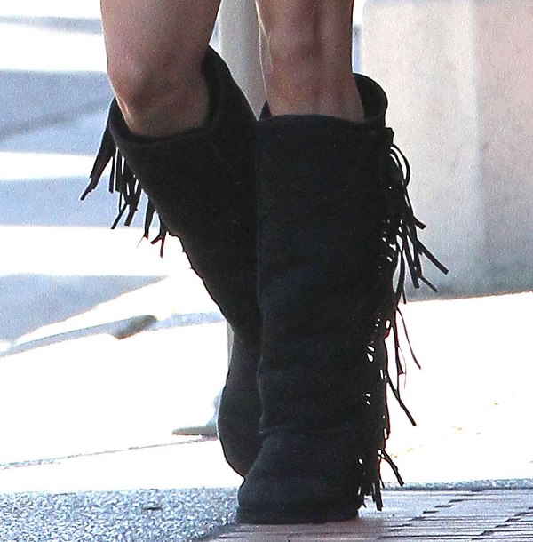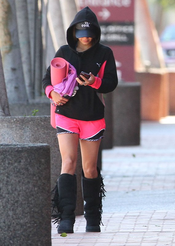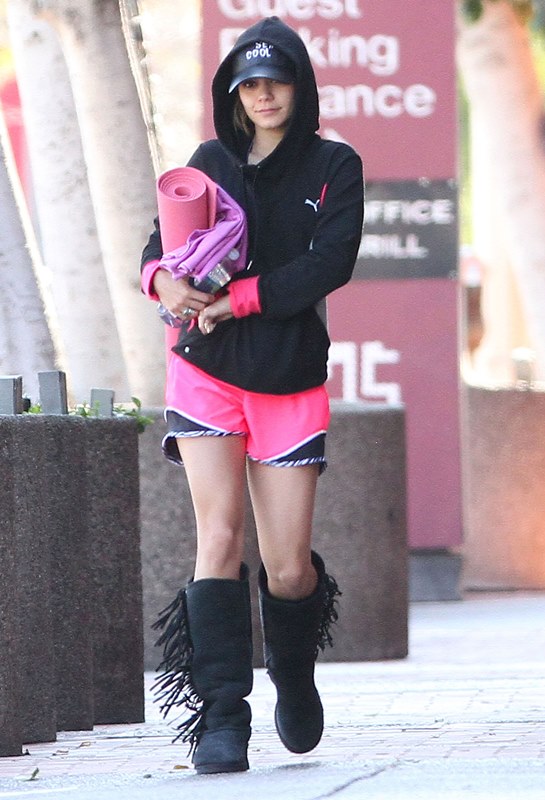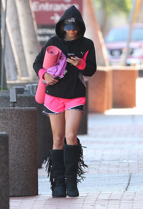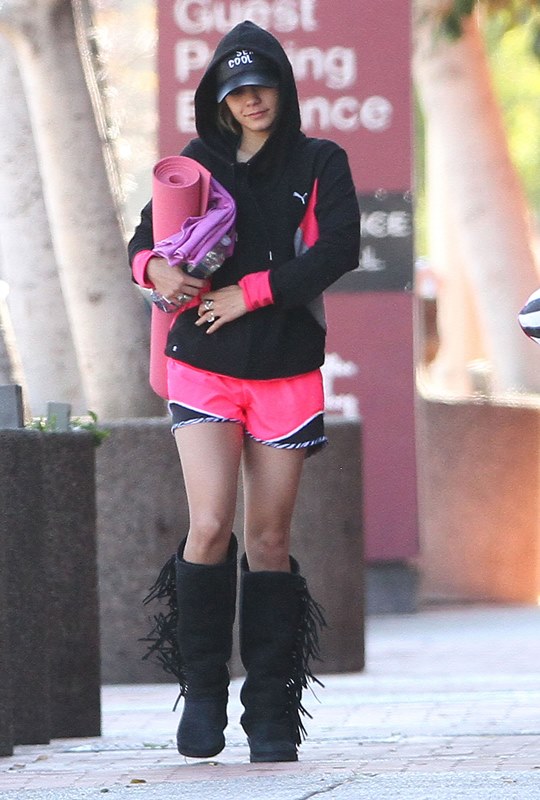 Check her out leaving a yoga class the other day wearing some stupid boots getting a head start on dressing like an asshole at Coachella.