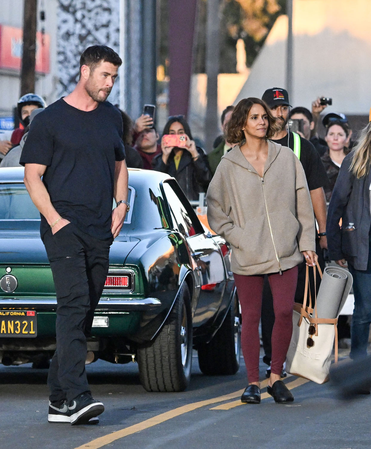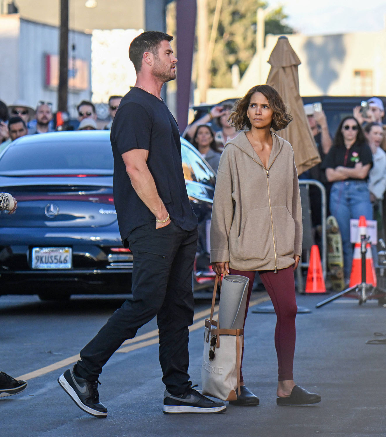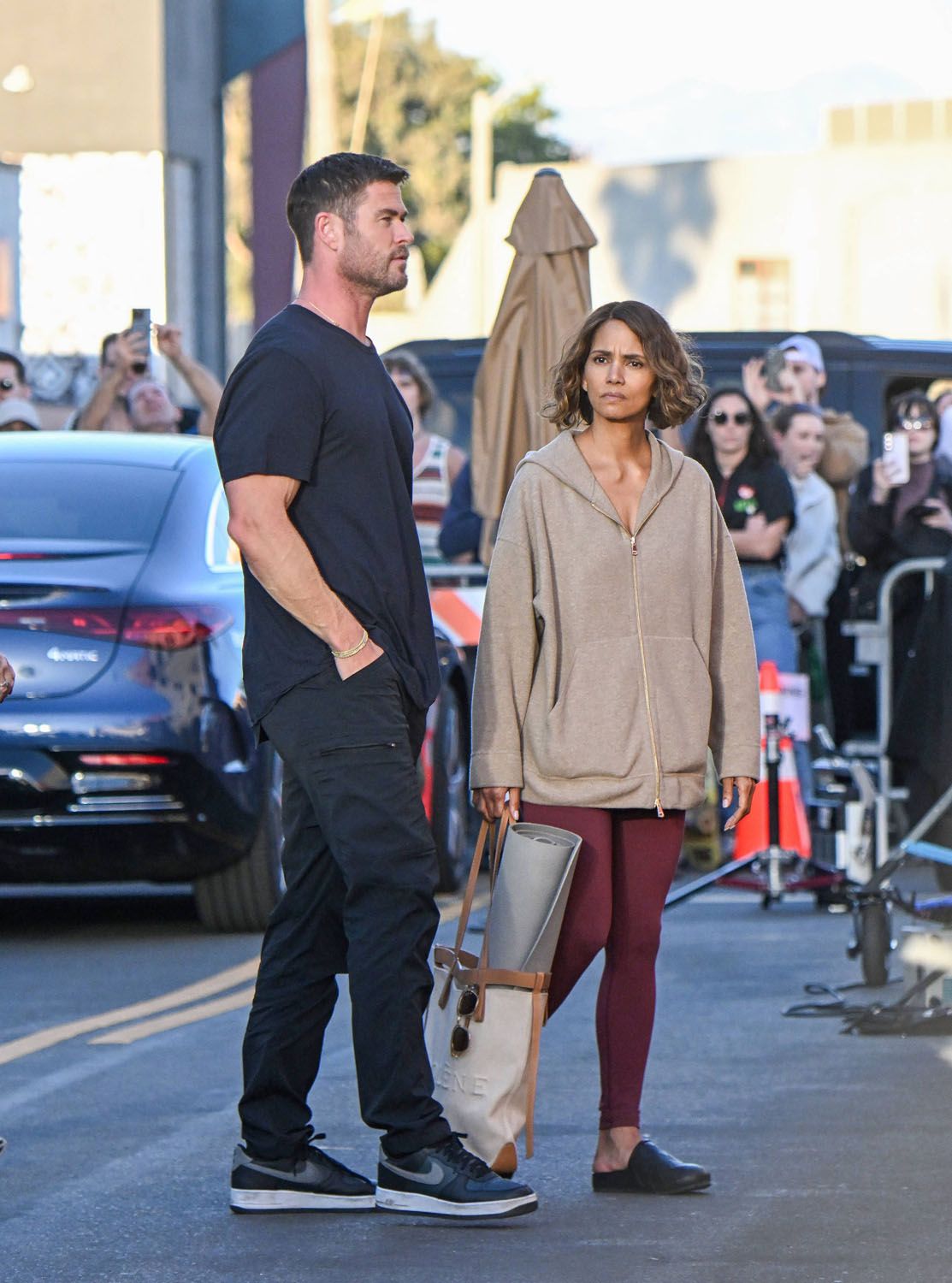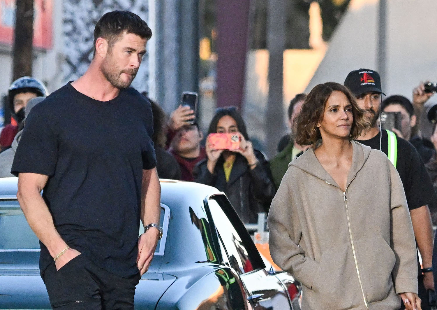 Earlier this week, Halle Berry was seen on set, filming Bart Layton’s new heist thriller, Crime 101. Yesterday, she was back at work but this time with co-star with Chris Hemsworth, the largest man. You know intellectually that Chris Hemsworth is a big dude, but then you see him next to regular people and it’s like yeah, Chris Hemsworth is the largest man.