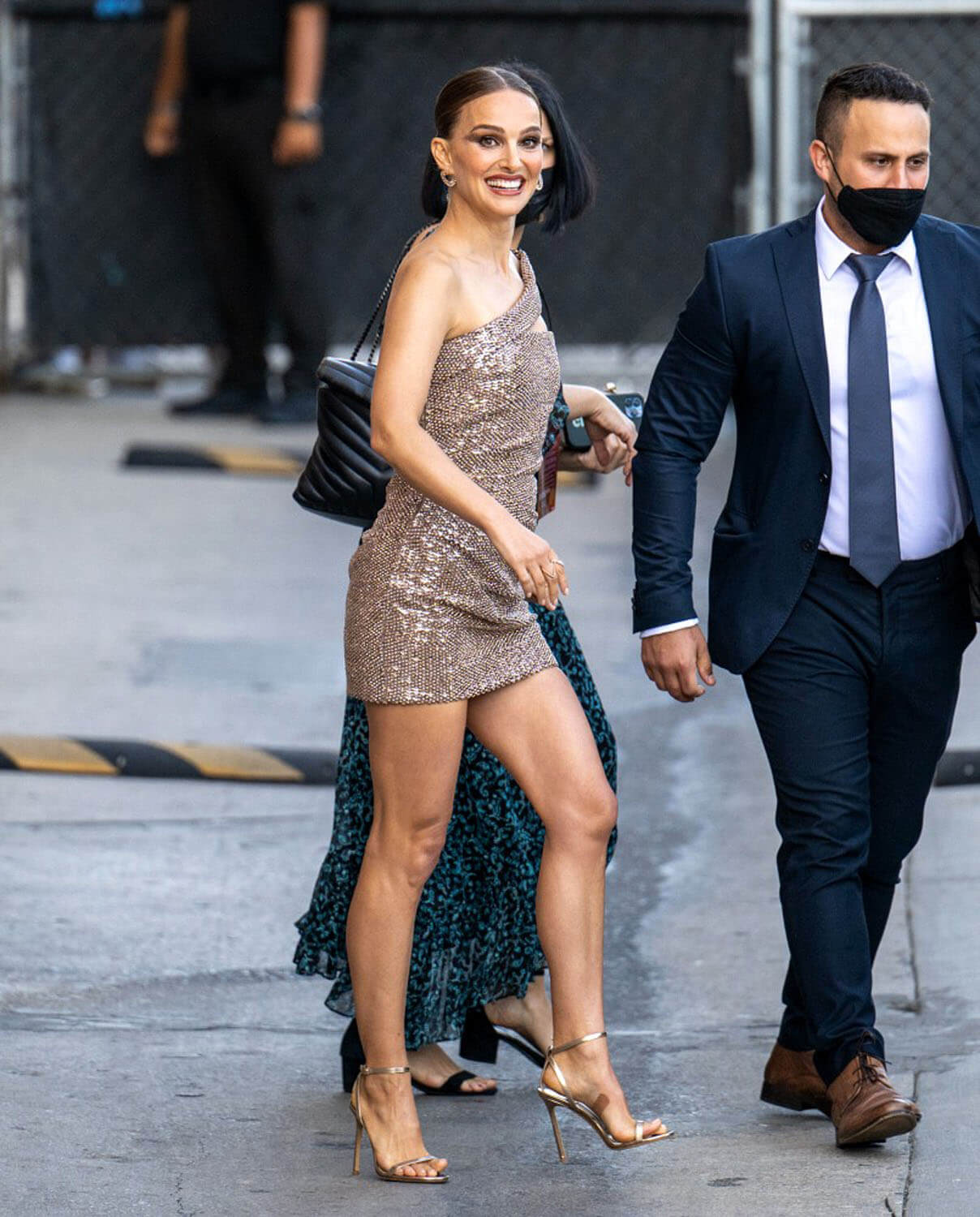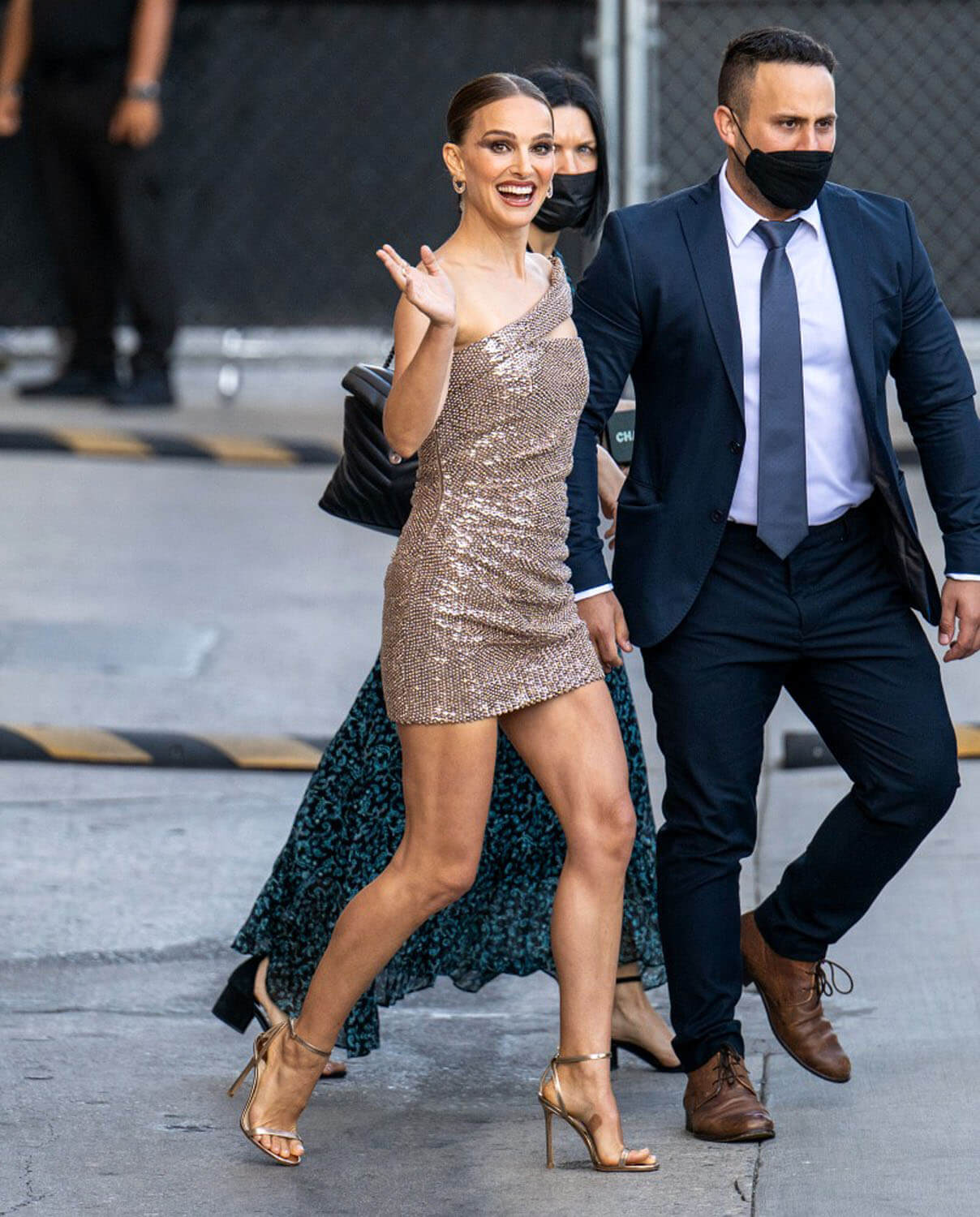 Bonus: here is Natalie Portman earlier in the day, heading into Jimmy Kimmel Live! in a short black dress and coming out in a short sparkly dress. With the slicked-back hair and dramatic eye makeup, it’s giving Vox Lux vibes.