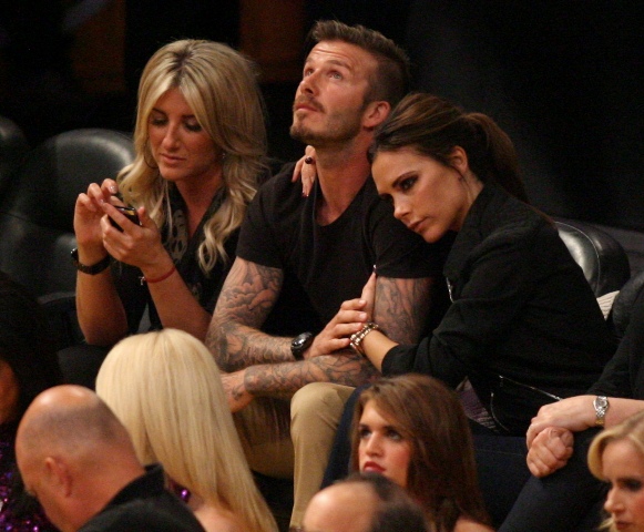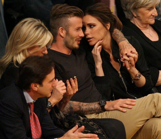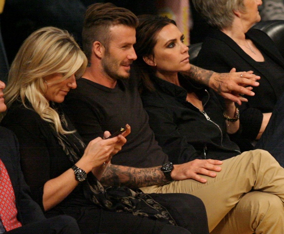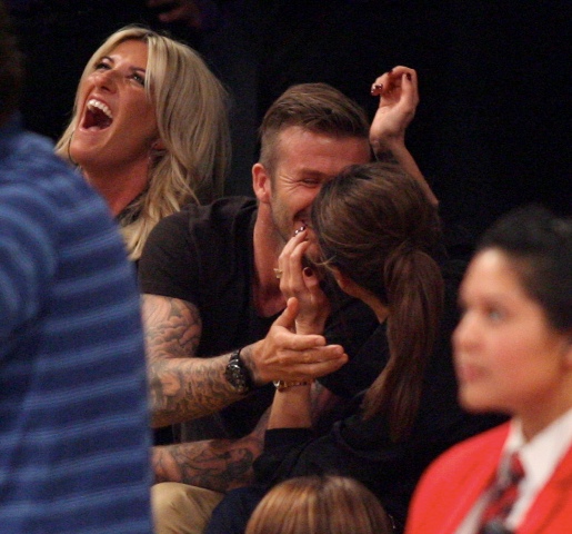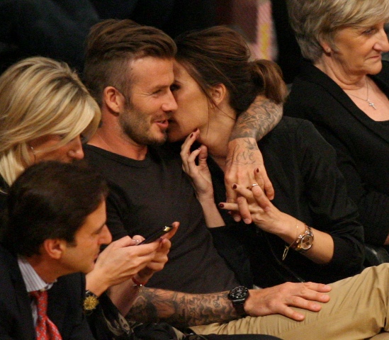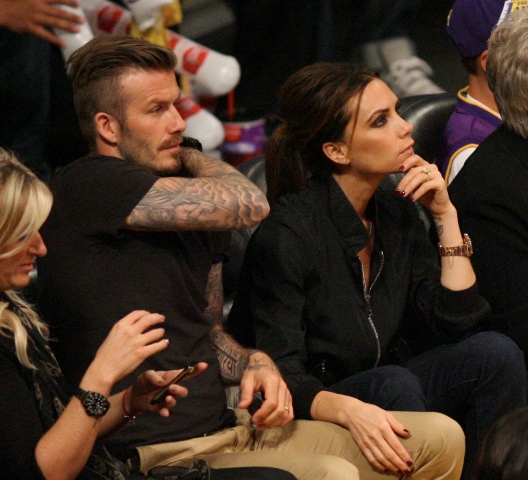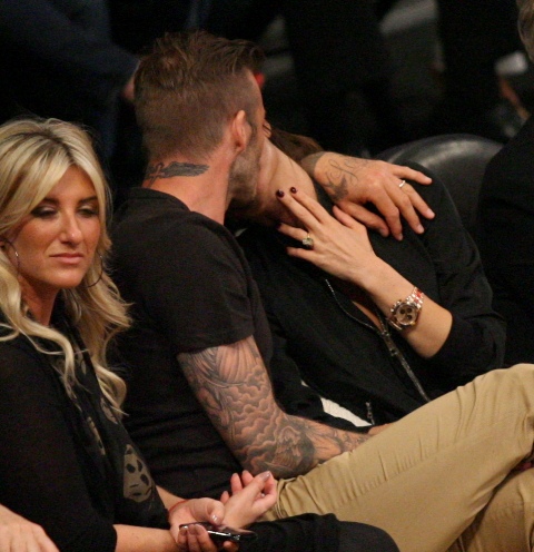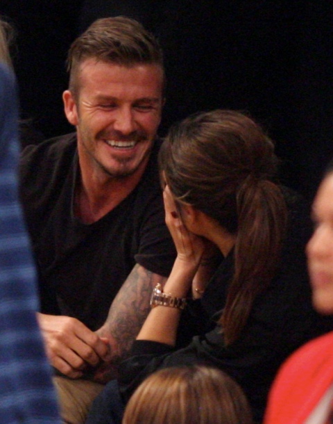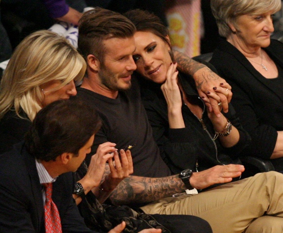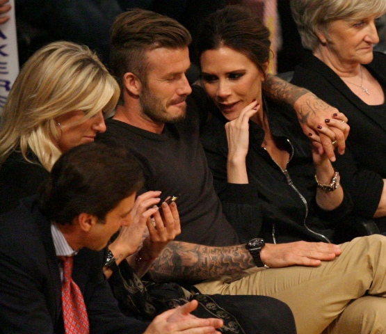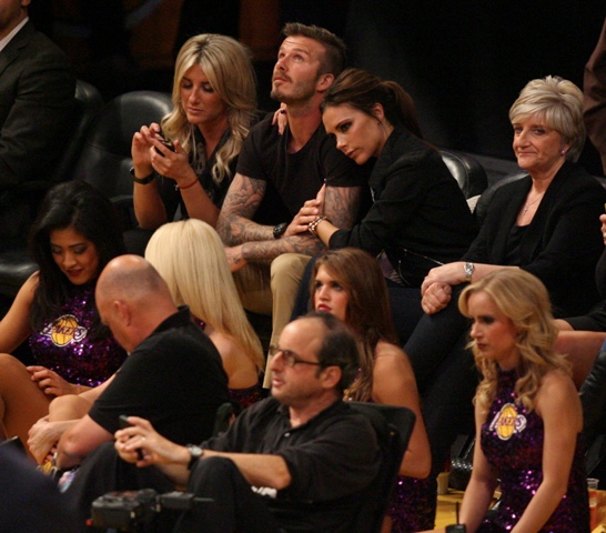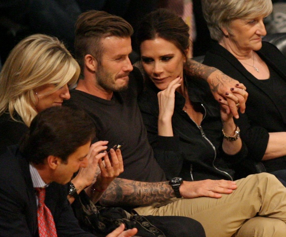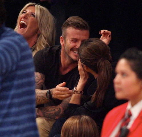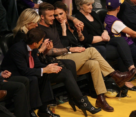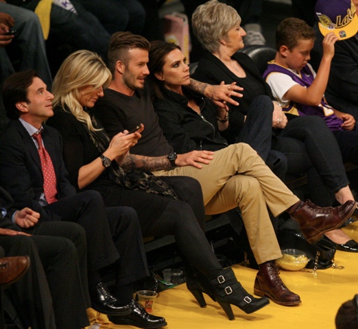 Victoria and David Beckham went to the Lakers game last night and put on a very Beckham display: there was hand holding, there was neck rubbing, and there was my favourite move, her hand on his thigh. Very proprietary. Once in a while when I’m cold at a hockey game I’ll ask Jacek if he wants to play The Beckham which means that he puts his hand on my thigh to warm it up. You can do it in reverse too. His hand, obviously, has a lot more territory to cover than David.