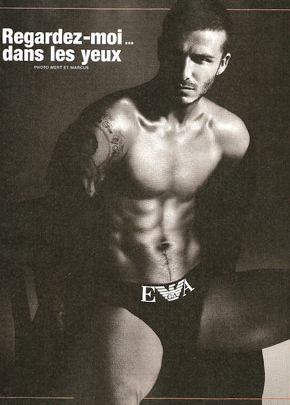 More mayjah quiveration – Becks for Armani. And while the shots of him in his undies are undoubtedly delicious, my favourite is the one where he’s walking with his shirt open and his pants ON…hanging delectably from a set of washboard abs and narrow hips.