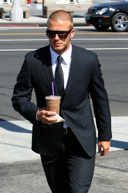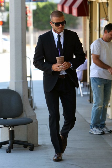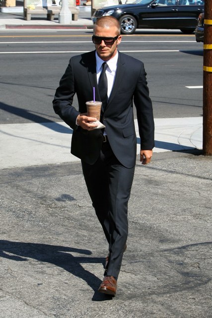 Here’s David Beckham the other day picking up an iced coffee in a beautifully tailored suit. And while I’m not totally loving his hair right now, the old tired pizza phrase definitely applies – Becks is never bad.