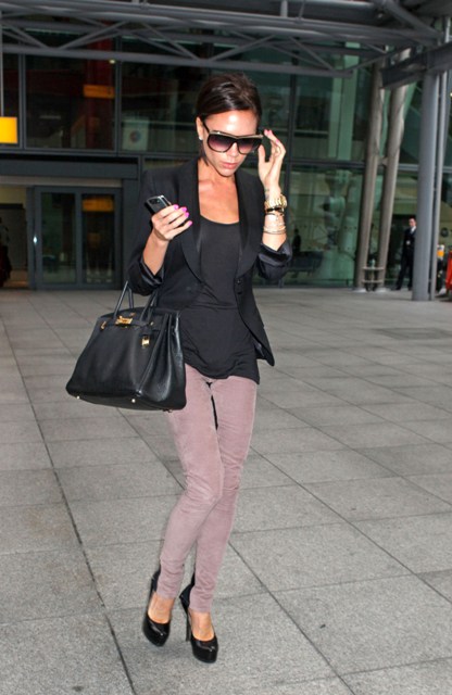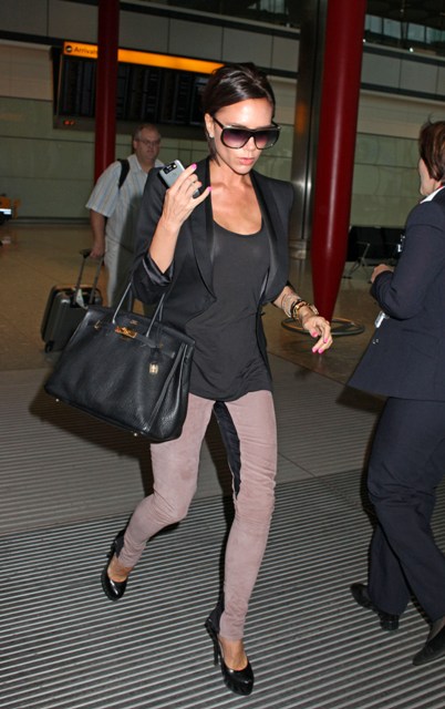 This is Posh arriving in London today in a pair of pants from her own line, with black patches on the inside thigh to further accentuate the thinness. The airport is her personal runway. They say the Spice Girls are working on a stage musical. Presumably Victoria is in town for a planning session. Or maybe she was just hungry for a photo opp. Also very possible.
