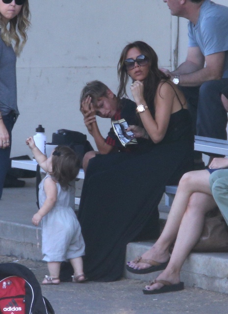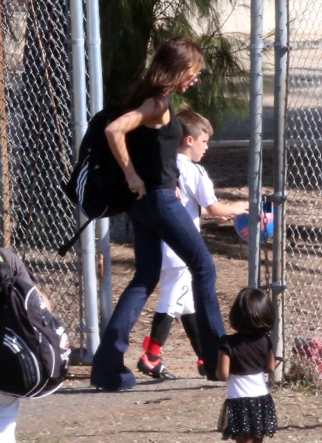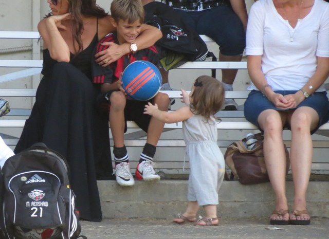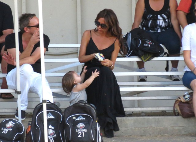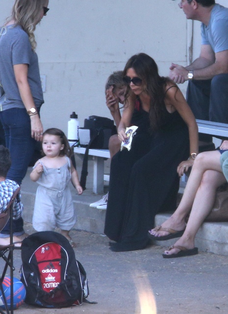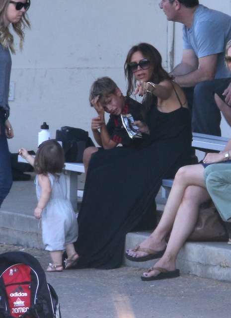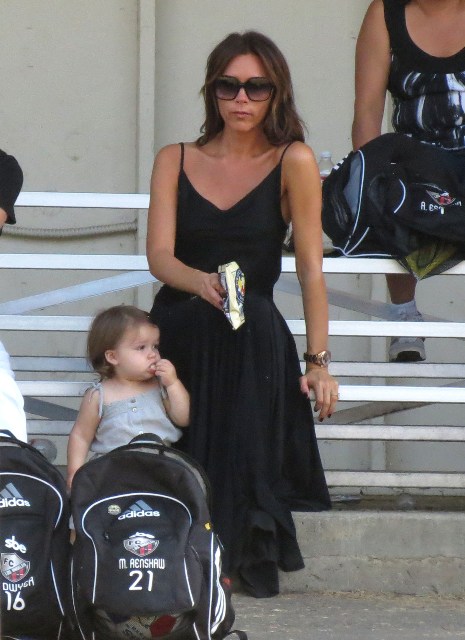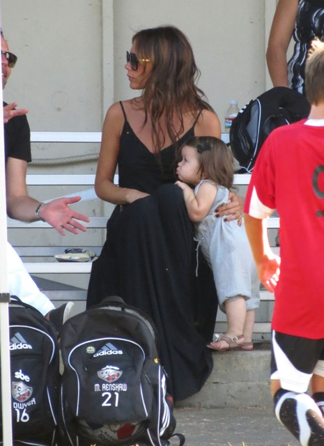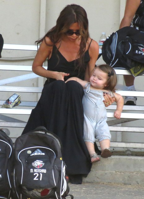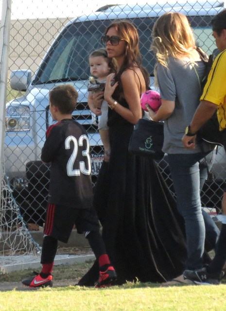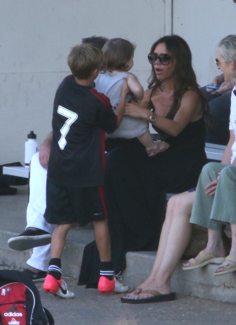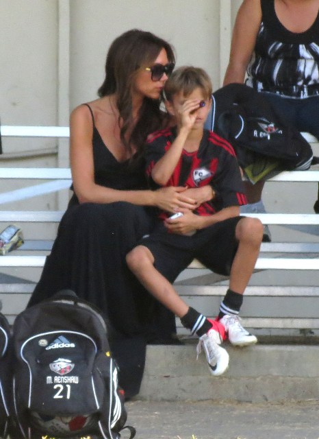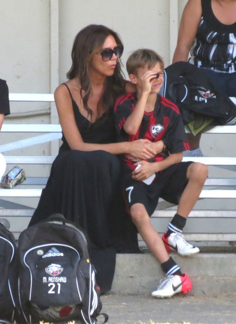 Victoria Beckham accompanied son Cruz to his soccer game yesterday. She threw his backpack over her shoulder as they were leaving. BUT IT’S NOT HERMES.