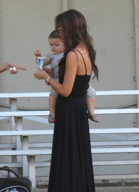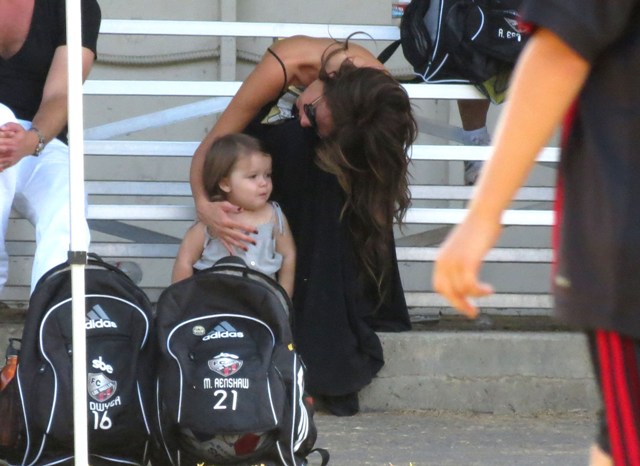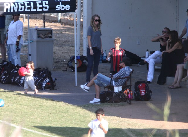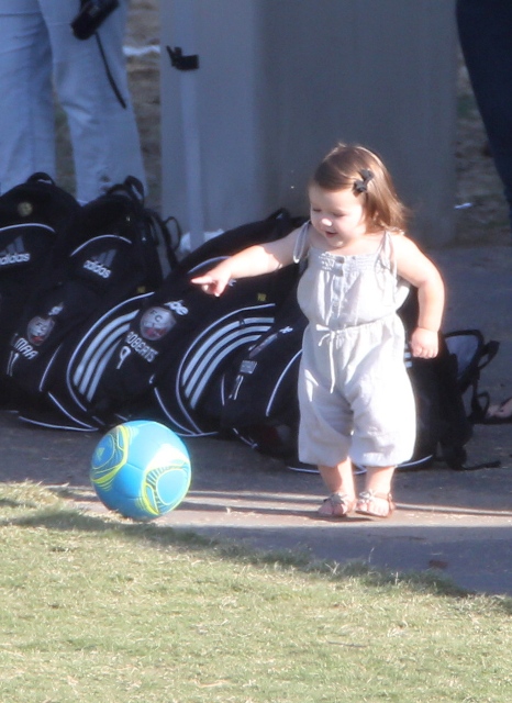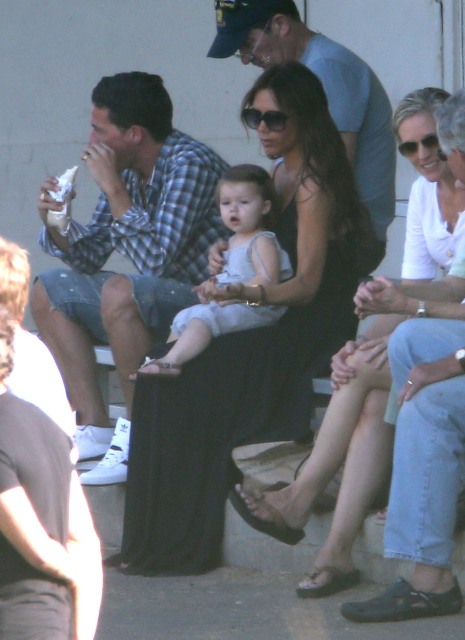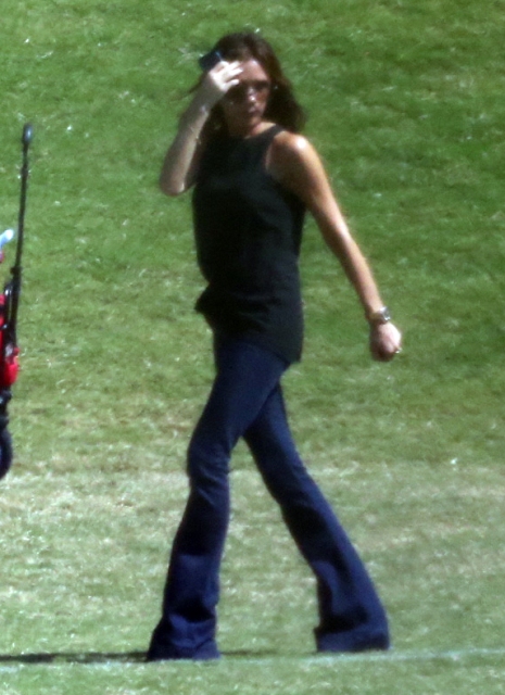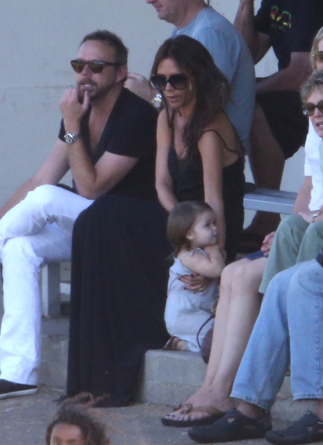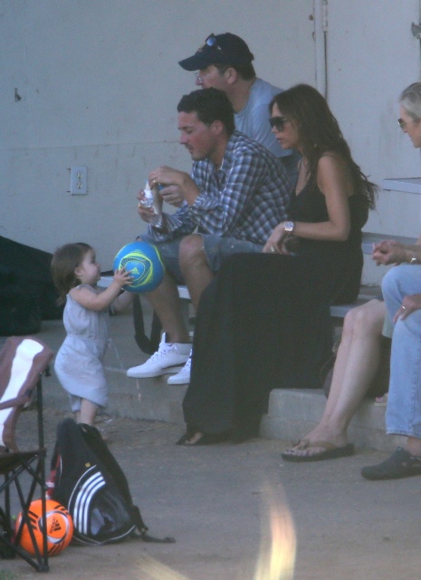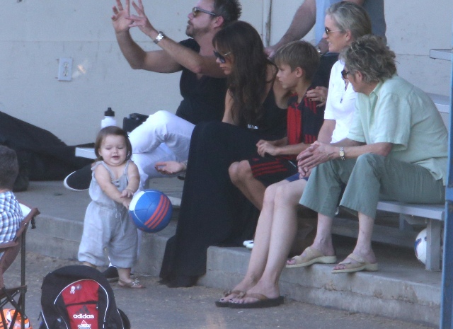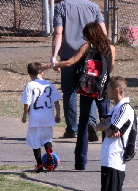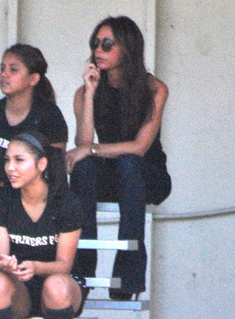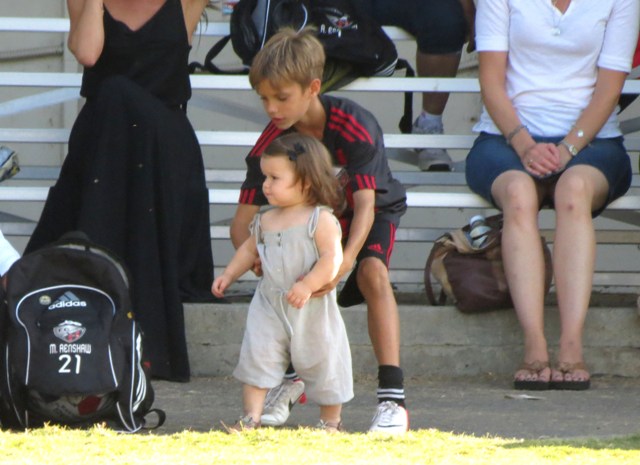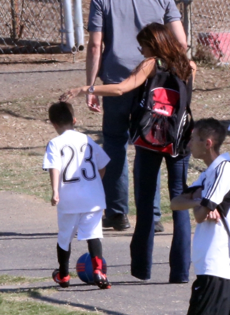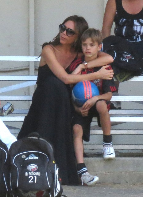 Victoria Beckham accompanied son Cruz to his soccer game yesterday. She threw his backpack over her shoulder as they were leaving. BUT IT’S NOT HERMES.