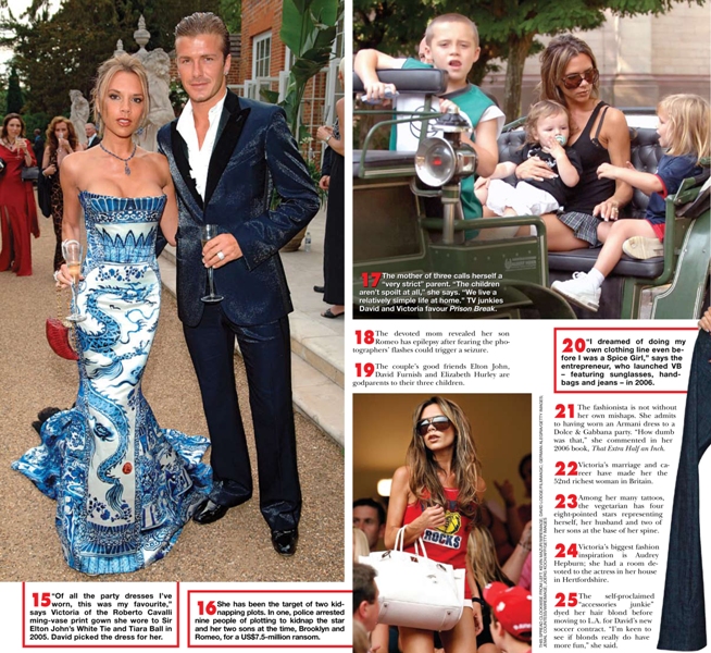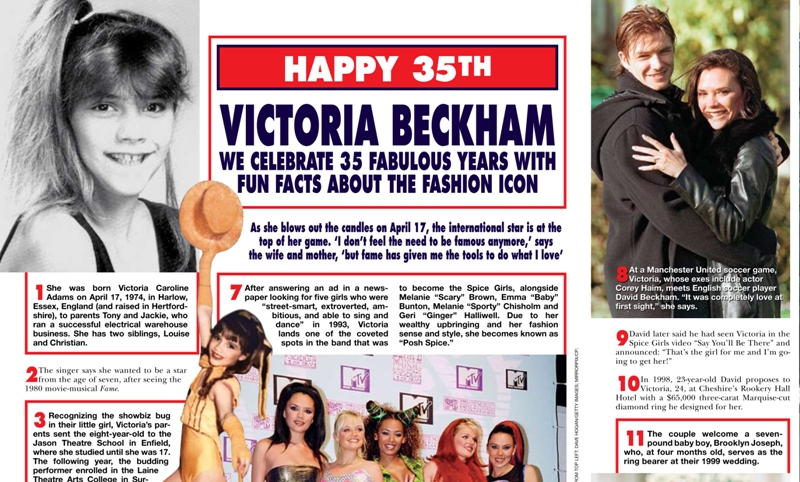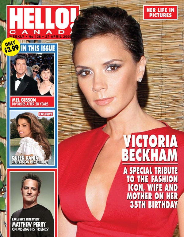 Oh Posh. Maybe this will cheer her up? She graces the cover of the new Hello! Canada in honour of her 35th with a look back at her past and a list of 20 (sort of) little known facts about Mrs Beckham.