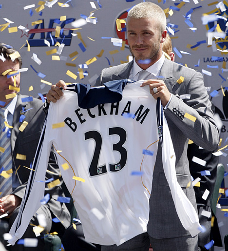 Here are the Beckhams being welcomed by the LA Galaxy today in front of a healthy-sized crowd. David will wear 23 and word is his jersey will generate brisk sales to the tune of millions and millions.