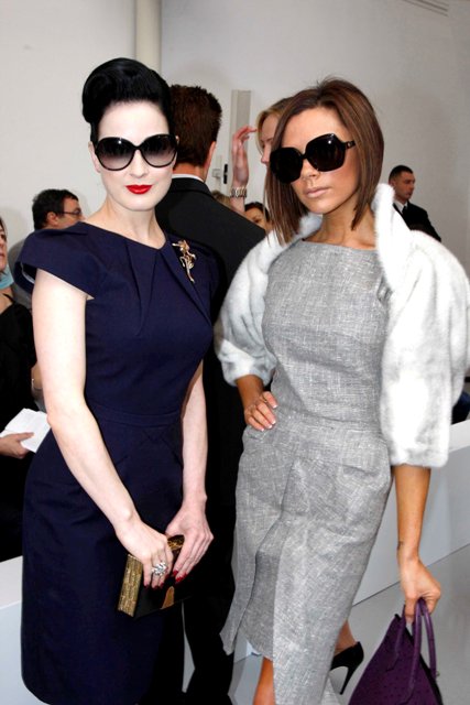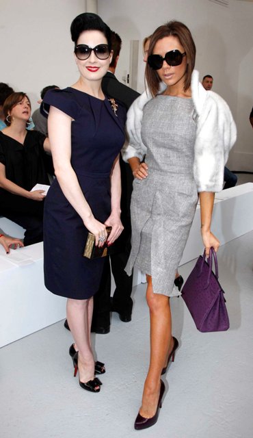 While her husband David Beckham gives back in Africa on a UN Children’s mission, playing with kids in Sierra Leone and doing something less frivolous for a change, his wife Victoria is exactly where she should be: front row at a fashion show in Paris. Orange and puckered and posed, here’s Posh with Dita von Teese and Claudia Schiffer at Roland Mouret, the designer of her famous Moon Dress.