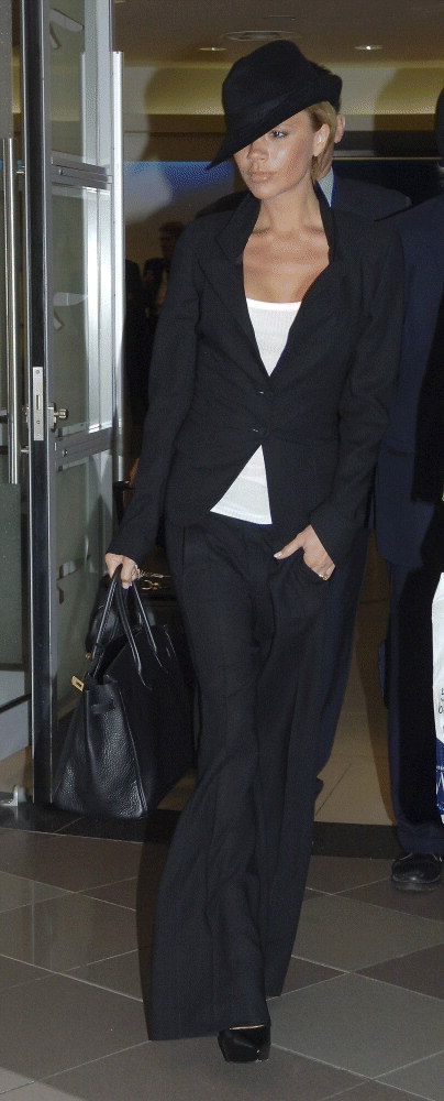 Leaving Heathrow on her way to LA this week, Posh attended by her hairdresser and her security team, giggling about something… and then quickly covering up, composing herself beautifully within four short shots, the smile gone in seconds, replaced by the ubiquitous cock-lips complemented by the stiletto strut.
