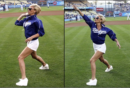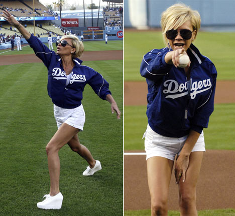 Here’s Posh throwing out the first pitch at the Dodger game yesterday. My girl is always f*cking hysterical, see? Endlessly entertaining.