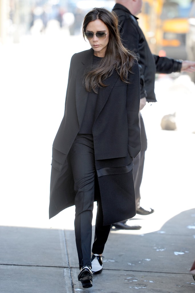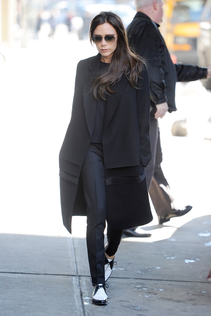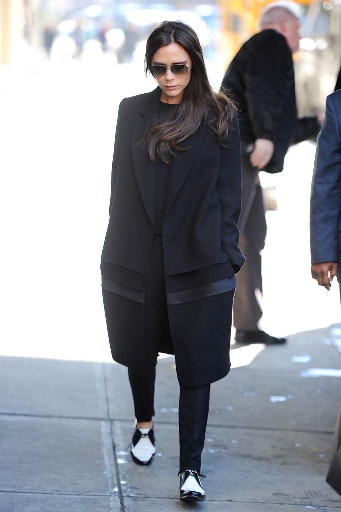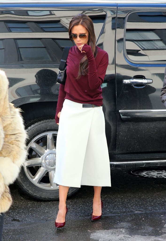 Victoria Beckham stepped out in a sick pair of oxfords today in New York. Posh is clearly embracing flats. She sent flats down her runway on Sunday at fashion week – click here to see the collection if you missed it yesterday. Not that she’s completely given up the heels though. It depends on the outfit. Yesterday the outfit was a long white skirt and a bordeaux sweater. With no coat. Not because it was warm – it wasn’t – but because she didn’t want to hide the ensemble. Fair enough.