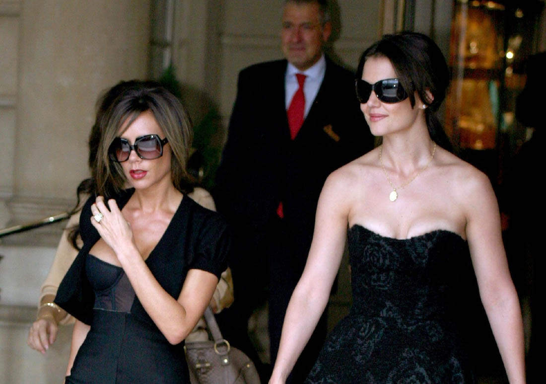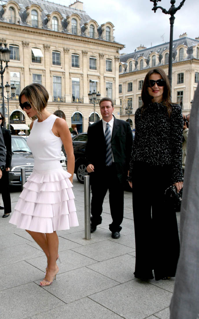 Holy heaving cleave! Check out Katie pouring outta her dress. Check out the diminutive Mrs Beckham making the normally normal-sized *Kate* look monstrous! Here they are again, in various stages of best friendship, taking Paris fashion week by storm.
