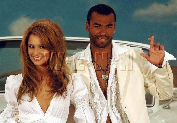 Remember Vicky"s protégé from the World Cup? Cheryl Tweedy ? Well, it looks like Posh"s got herself a little clone because as you can see, Cheryl and her fiance Ashley Cole are trying out the Beckham vibe while hawking some lottery thing in the UK today. I"m thinking a little more practice and a little less cheese? And…is it just me or does this scream budget? Ummmm…Cheryl, love. We"re not quite there yet, are we? Victoria might be anorexic and she"s definitely a bitch but Mrs. Beckham never, ever looks inexpensive. Photo source