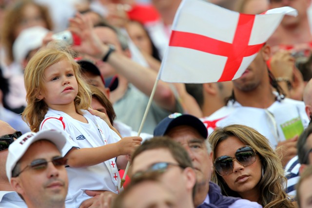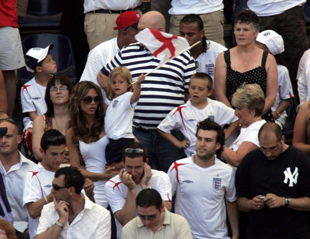 I’m telling you, I cannot wait to see what Romeo will look like in 15 years. Romeo and Apple Martin – the future of gorgessity, non? So anyway, here are Posh and 2 out of 3 at the England vs Paraguay game Saturday… still leaving us wondering about the mysterious Cruz. Where is he? As for Victoria herself – please don’t knock The Posh. The Posh actually looks alright here. Skin is covered up nicely, no discernable spots – you could say it’s an acne-free week to go along with her sex-free month. From what I hear, it’s been a while. Because of training schedules, of course. Remember, in my naïve Beckham daydream, the Posh and the Becks adore each other and would never be unfaithful (again), right?
