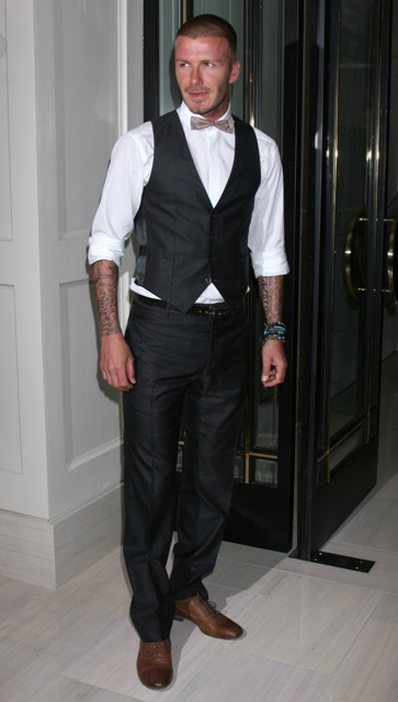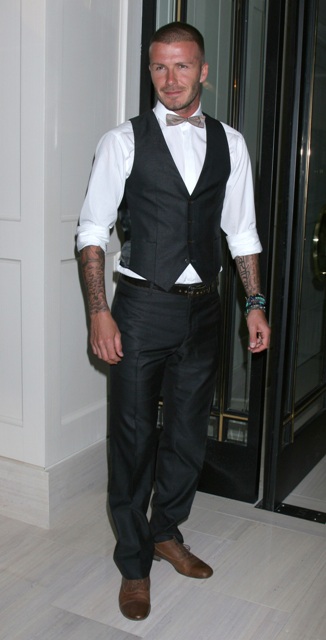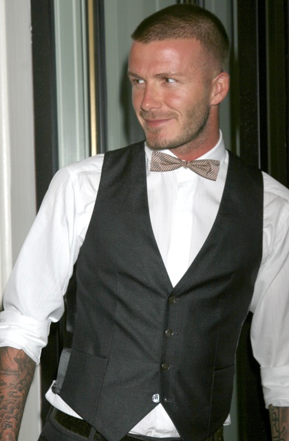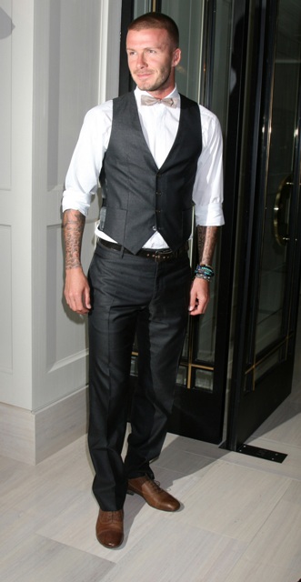 David Beckham at the Gordon Ramsay opening last night, as usual, quivering my loins in a bow tie and a waistcoat with pants that fit perfectly.