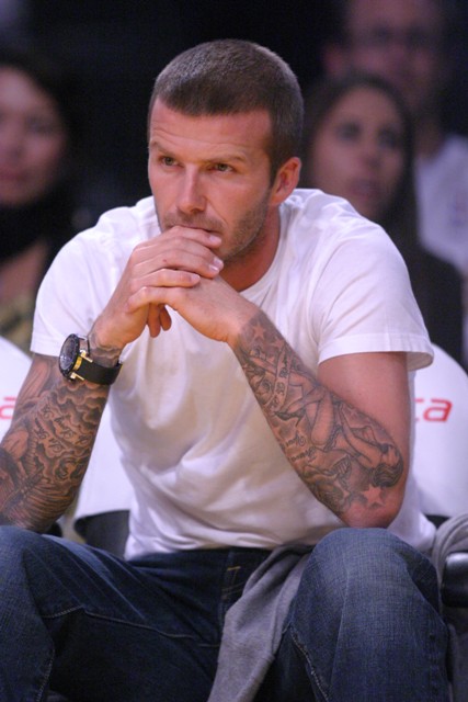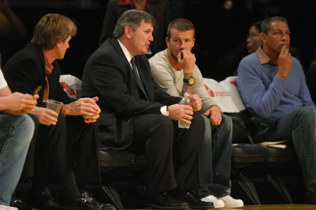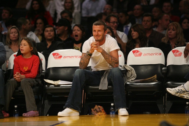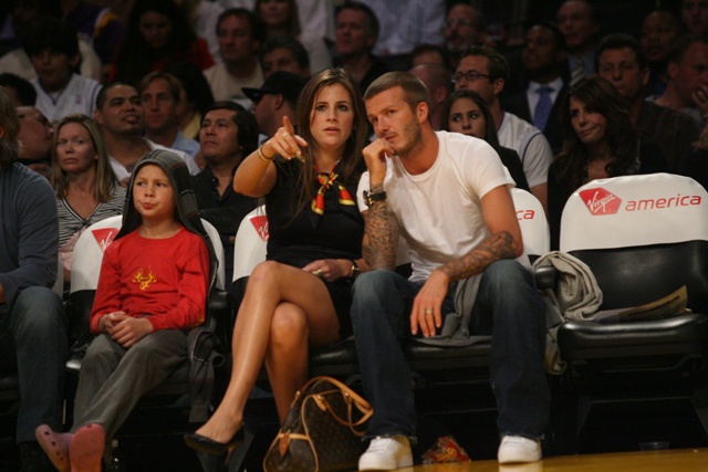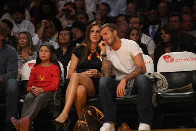 Let her have her small victories though. Because while she was busy trying to outshine and out-thin everyone else, David was at the Laker game, chatted up by a few suits, and then by a very attractive socialite type called Francesca Leiweke who apparently enjoys dressing like a flight attendant. Bet your boob job Becks loves to role play!