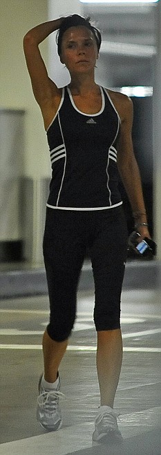 A rare photo of Victoria Beckham after a workout – no makeup. And she’s really, really pretty. So much less harsh, less fake, less waxy. Of course in her mind she probably thinks she looks like sh-t. Dumbass.