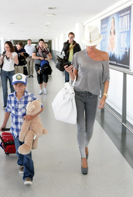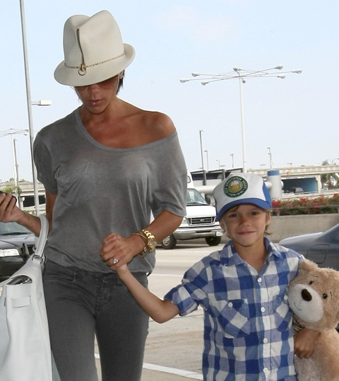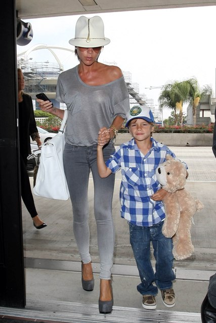 Victoria Beckham travelled from Los Angeles to London yesterday and tried desperately to go unnoticed by wearing a large white hate, carrying a large white bag, in sky high heels, with Romeo and his teddy bear. Romeo used to look a lot like mum but is beginning to resemble dad more and more. Gorgeous boy. He should date Apple Martin. Gwyneth would lose her mind.