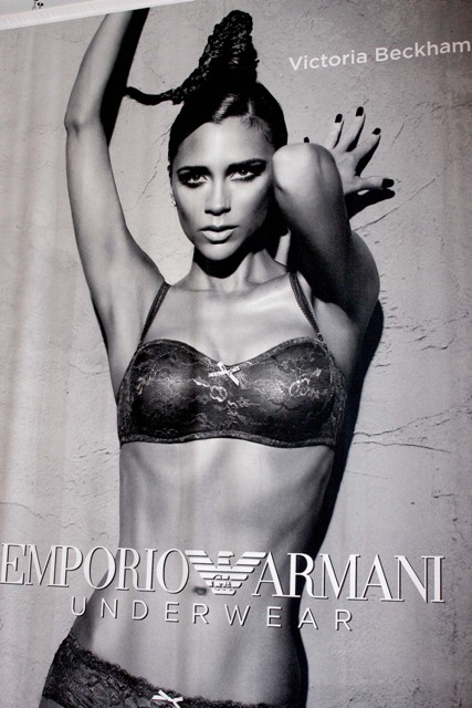 For now then, Posh will simply have to satisfy herself with her new Armani underwear ads, unveiled today at Macy’s Herald Square in New York. As you can see, Mrs B is showing off the fruits of her starvation. And also the work of her plastic surgeon. Very impressive.