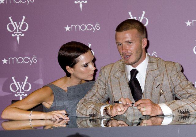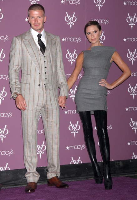 Here are Victoria and David in NYC at Macy’s on Friday promoting their new fragrance Signature. She is wearing thigh high boots, 5 and a half inches… without a heel.