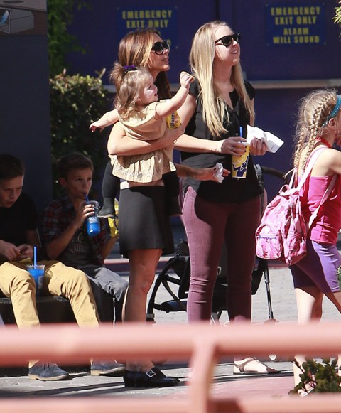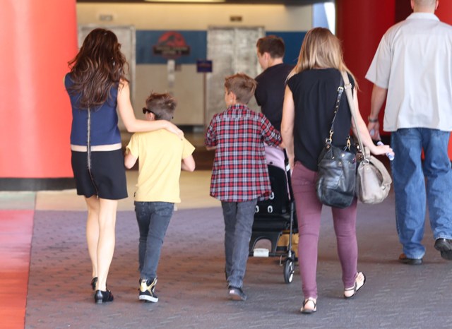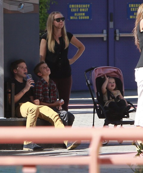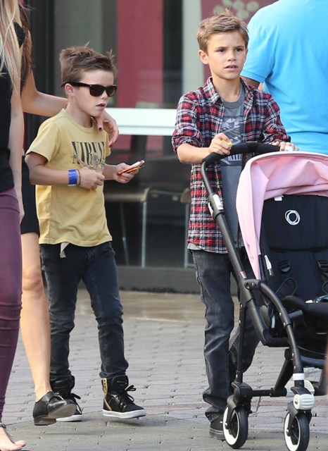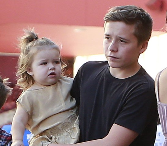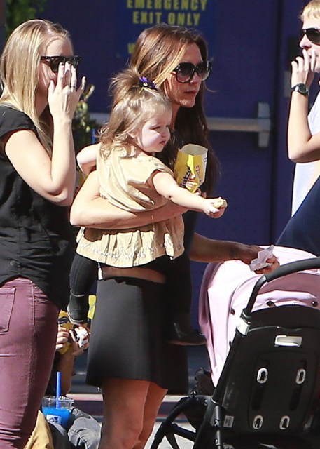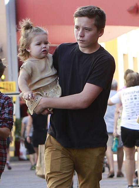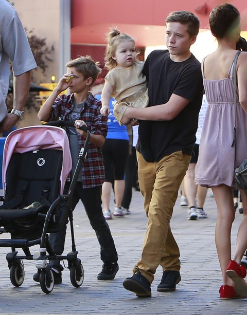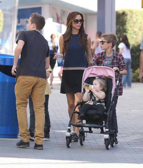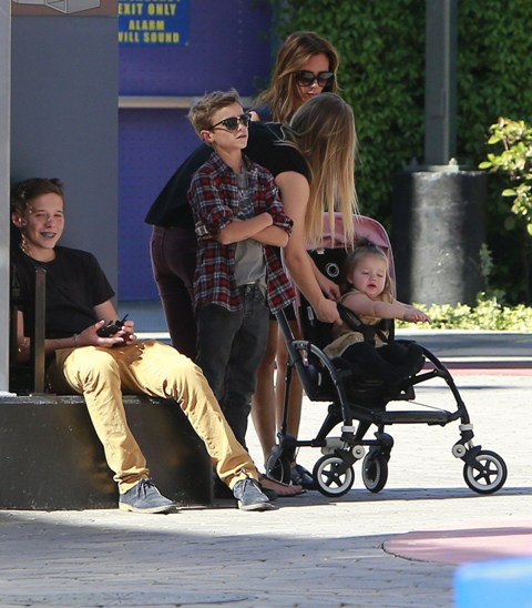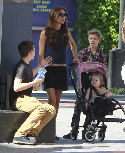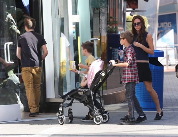 Here’s Victoria Beckham with her kids at Universal City Walk this weekend. Her shoes take me back to private school uniforms in the 80s and 90s. That’s exactly the style we’d wear on our feet with our kilts. As you can see, H7 was carried around by her big brother Brooklyn for a while. This is really, really cute, right? I grew up hanging out with 3 cousins, all boys, every weekend, completing the two on two situation for any given game of pick-up: street hockey, basketball, football, handball, video games, whatever it was, I was part of the team, and it didn’t matter that I was a girl. They threw hard. No less hard on account on my gender. I wonder if it’ll be the same for H7. I wonder if she’ll ever take a ball to the face. I wonder which one of her brothers will be the most intimidating with future dates.