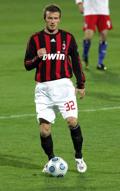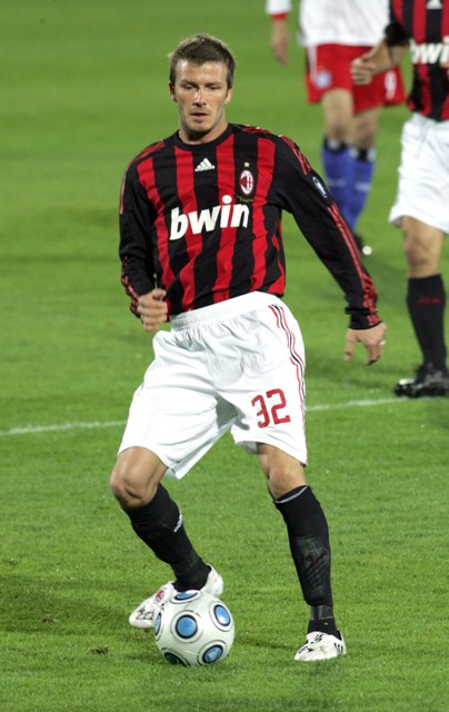 David Beckham playing for AC Milan today in Dubai. He looks great in red and white, non? Grow grow grow that hair!