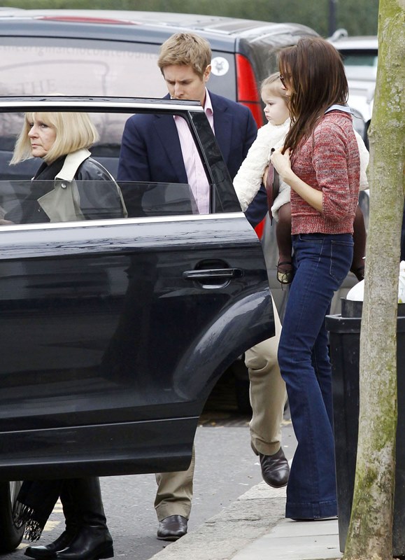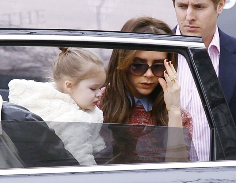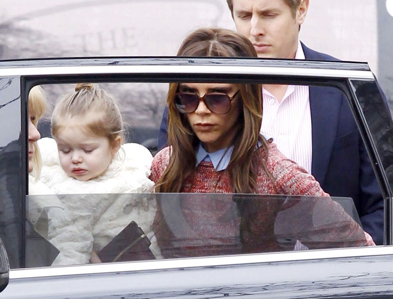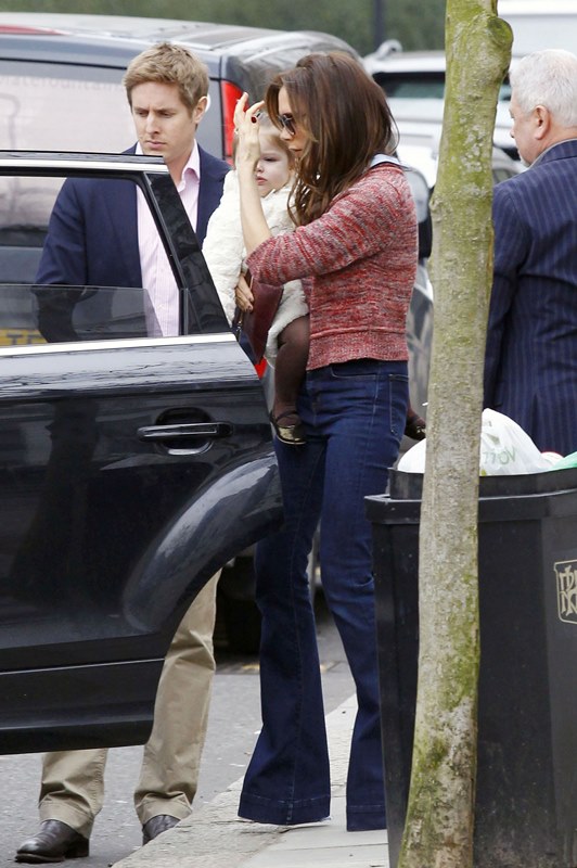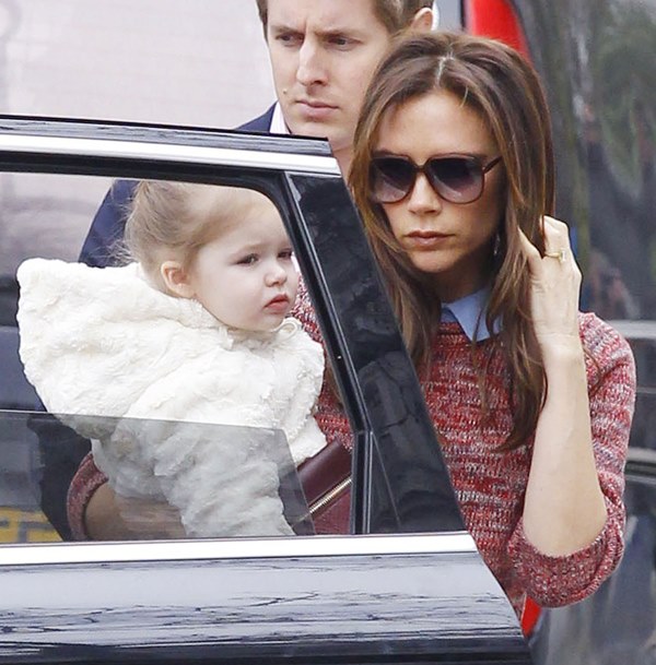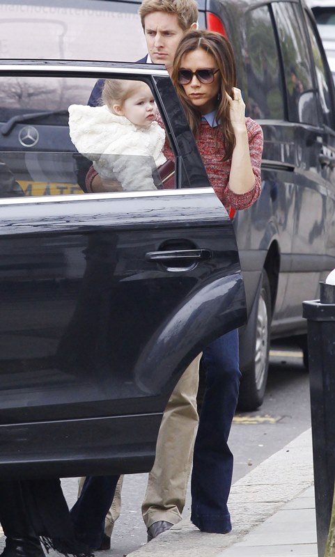 Here she is carrying Harper with one arm today. Her upper body strength must be amazing. After 15 seconds of carrying my son like that I tap out and do the hideously unflattering (and unphotogenic) two-arm waddle because 1. My arm is tired and 2. I feel weirdly off balance, and I barely wear really high heels. From the looks of it, my son is smaller than Harper, so seriously – does Victoria work out with a trainer especially for this pose? Or am I just exceptionally wimpy?