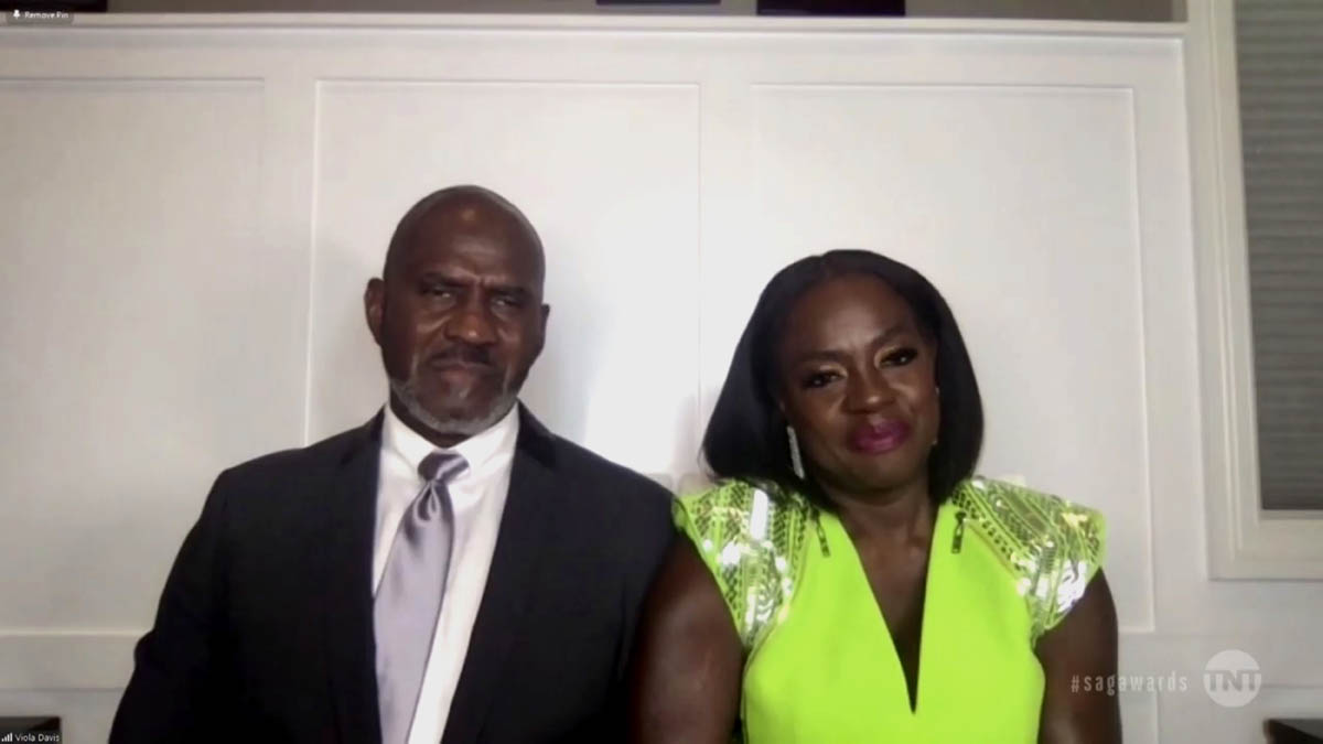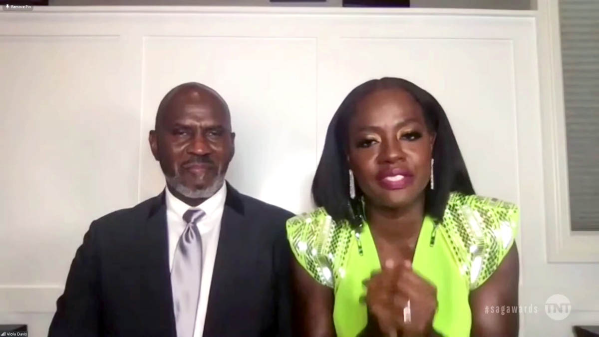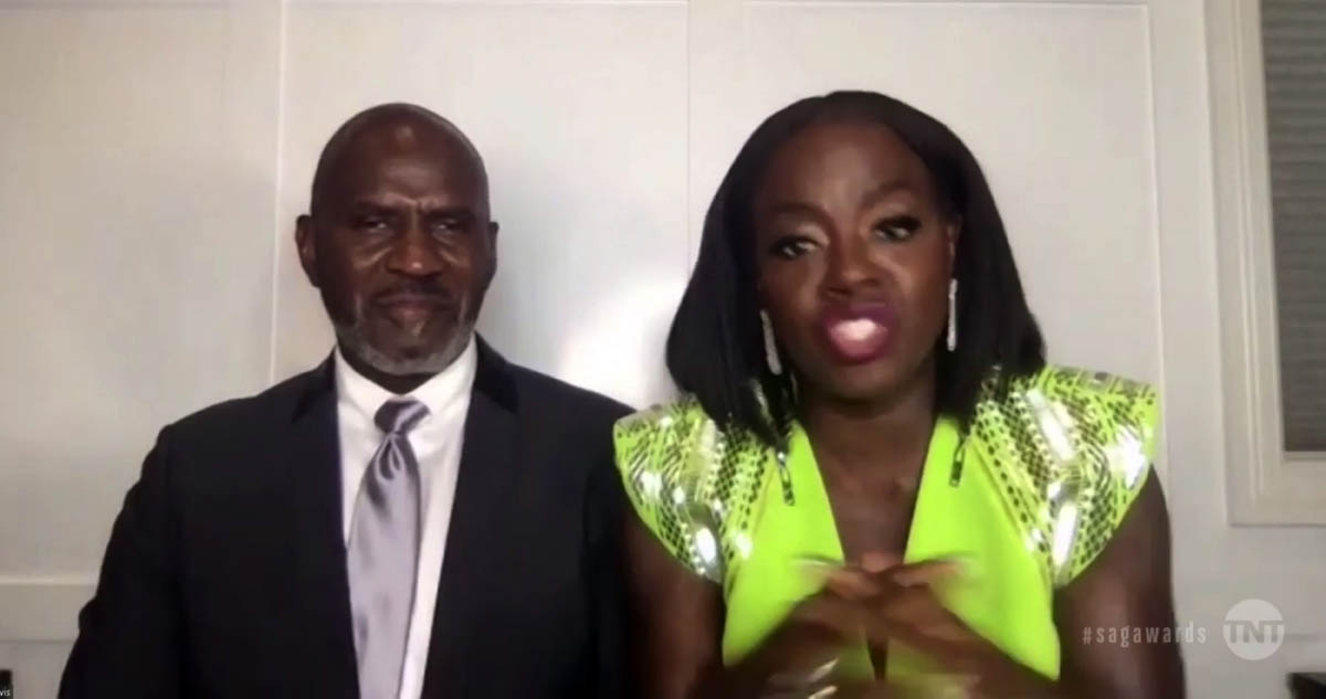As for the fashion, how about Viola Davis in neon? It’s Louis Vuitton, a perfect choice for Zoom acceptance speeches because the shoulders are doing all the work in the shot. She looks unbelievable: