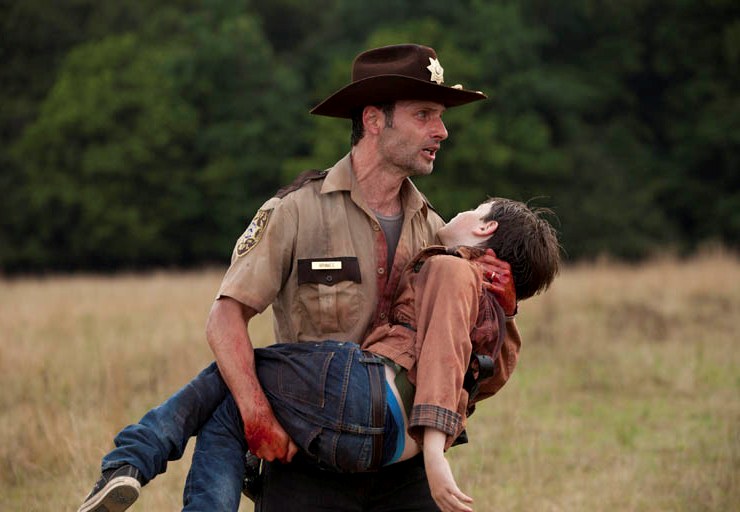 Cut to the present day. Officer Rick, holding Carl, is running through a field with Shane and some fat hunter. The fat hunter shot Carl. We’re about six months into the zombie apocalypse. How are people still fat?