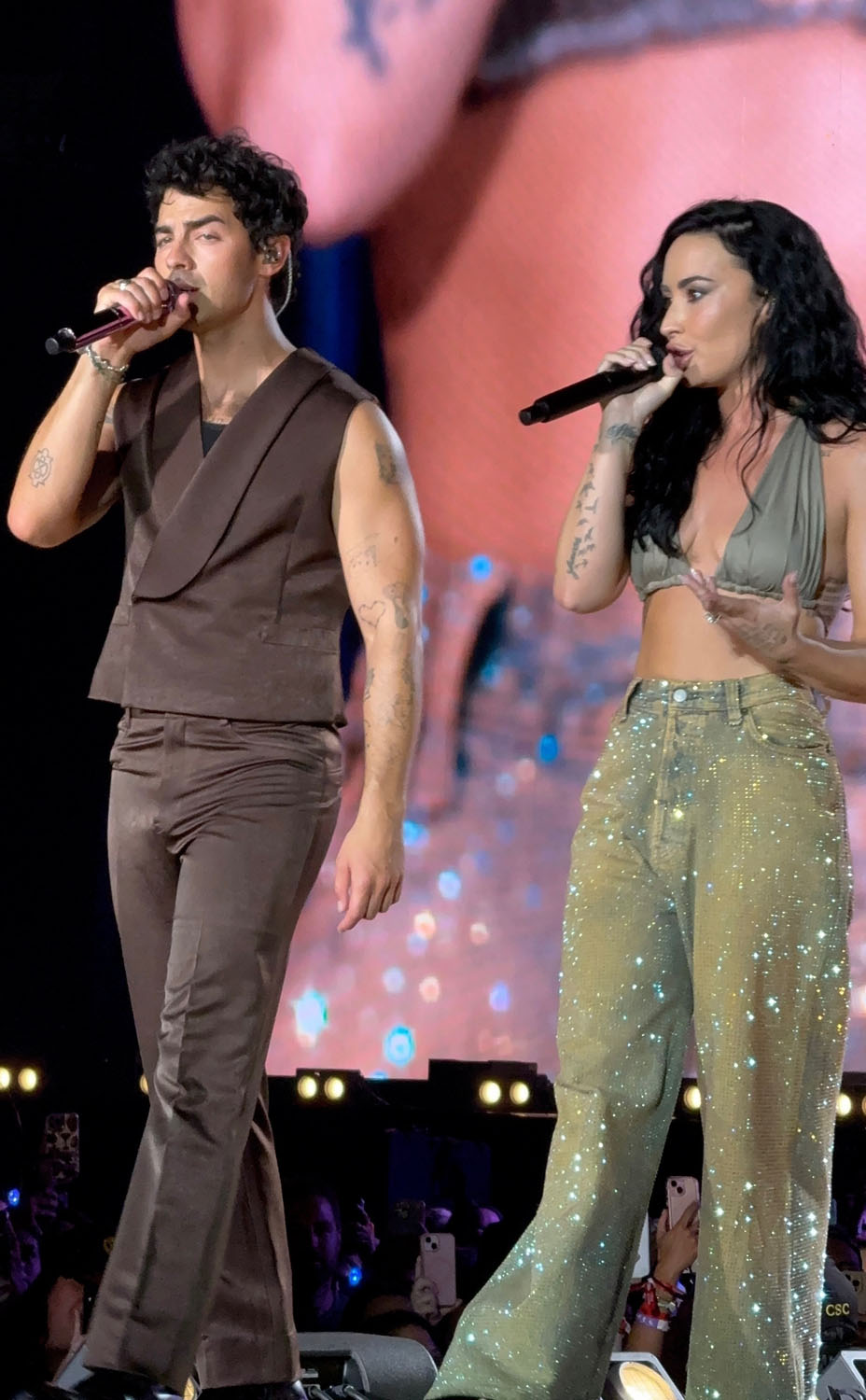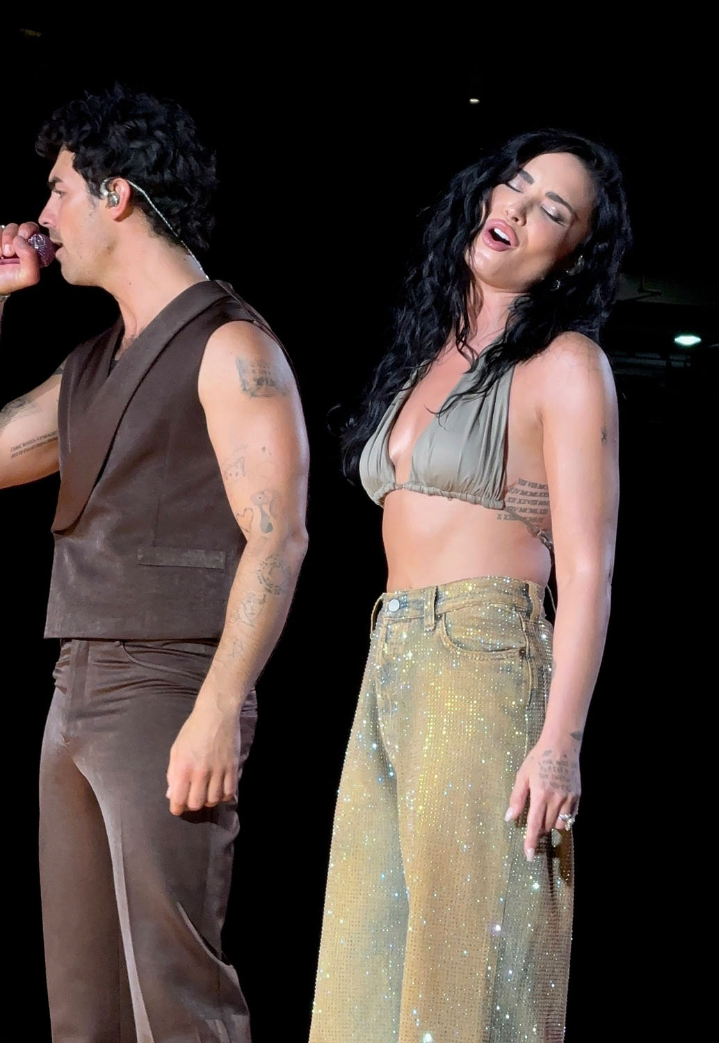 Demi popped up on stage in a sparkling bra and pants set looking as fierce as she has been presenting in recent weeks. The launch of her latest single “Fast” has her embracing her sexuality and confidence in a big way, and from the looks of her performance last night, that also means healing old wounds. Demi married Jordan ‘Jutes’ Lutes back in May and has been beaming positive energy ever since. Jordan was by her side last night at the show, cheering her on from the audience. Clearly, he recognizes that he married a Disney Channel legend, and last night was his chance to see her shine completely in her power. It’s also no secret that Demi has a romantic history with both Joe and Nick Jonas, so being able to put the past aside to create a pop culture moment for the fans shows a kind of growth on Demi’s end that only comes with time. Demi first fueled rumors of a reunion of sorts when she followed Nick Jonas on social media over the weekend after she had unfollowed him all the way back in 2018, sending fans into a frenzy about if something was brewing or if it was just a case of Twitter fingers.