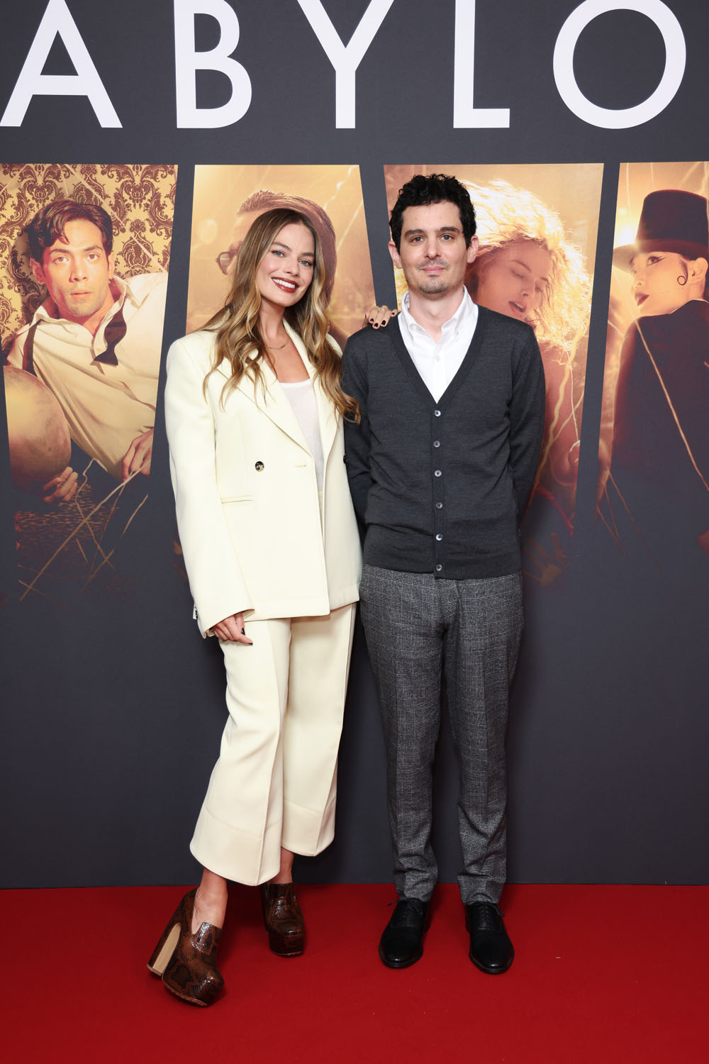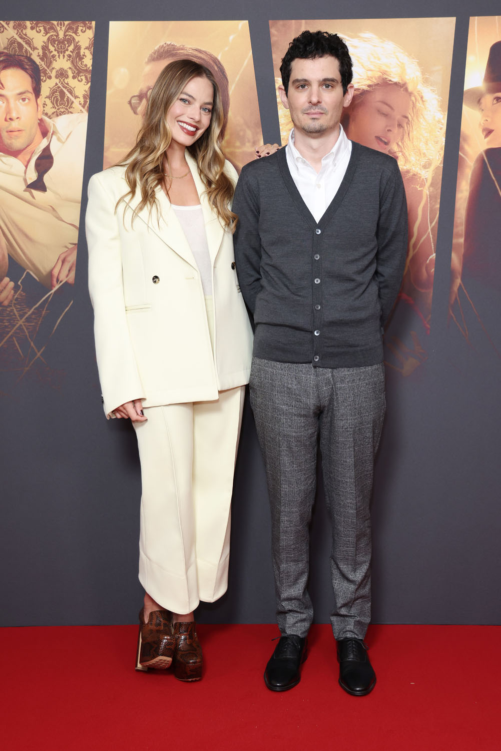 Right now, Margot seems to be the face of Babylon, involved in most of the promotional activity and the one who’s being talked about as a Best Actress nominee. Here she is with Damien in London yesterday in what is probably not a Chanel outfit, which is why she looks so great in it. And those shoes!