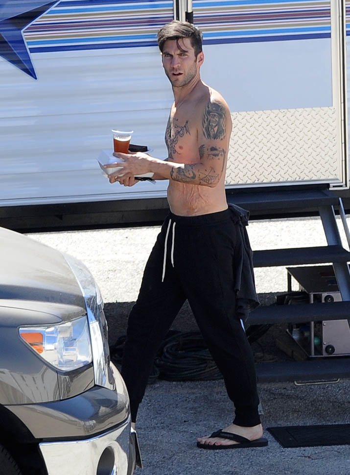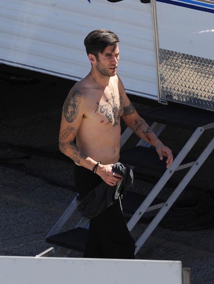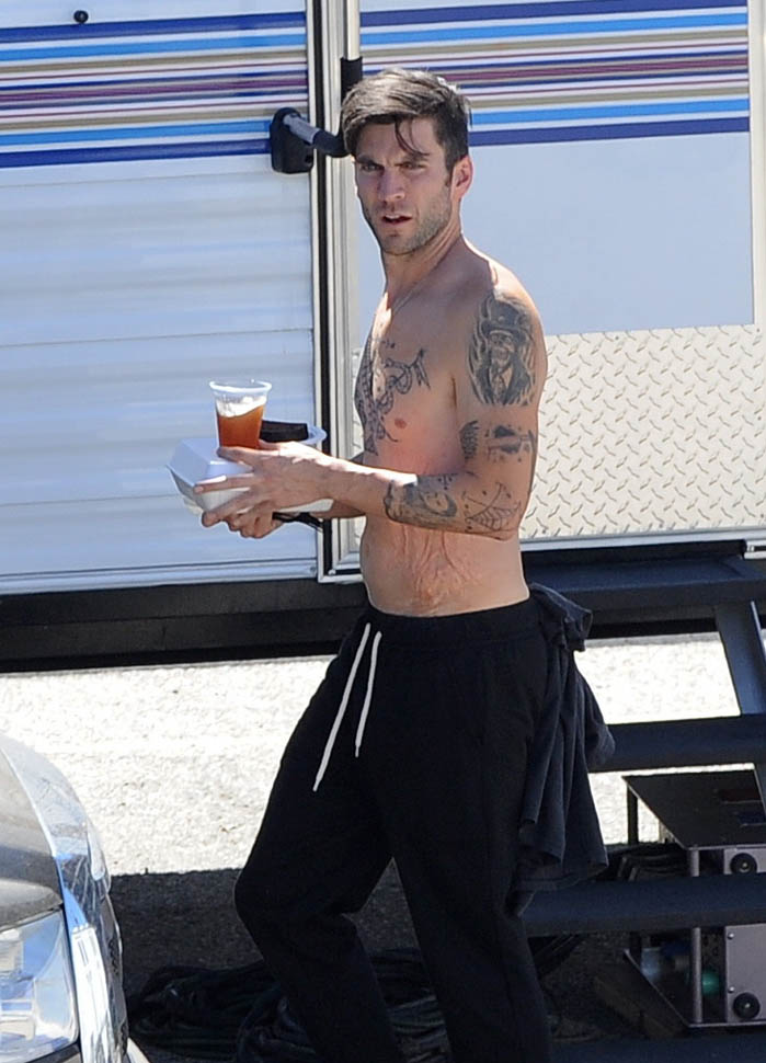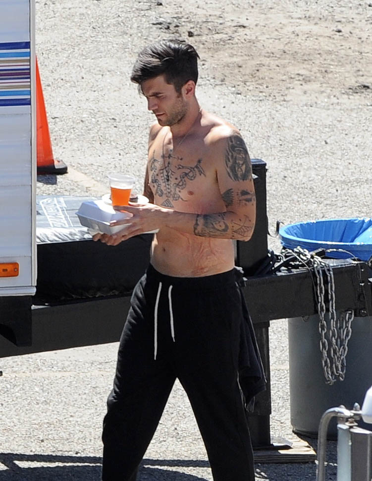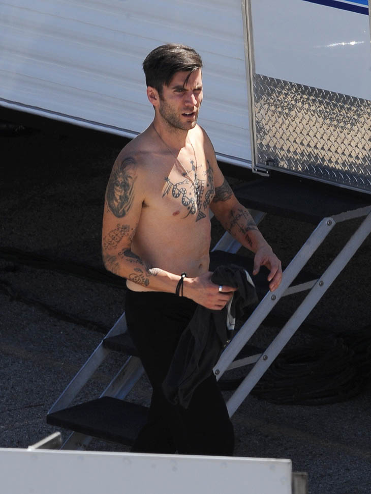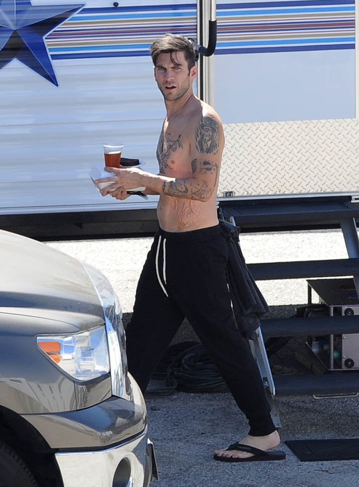 Here he is on the set of Broken Vows yesterday with his shirt off.