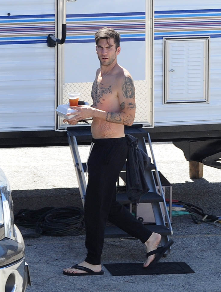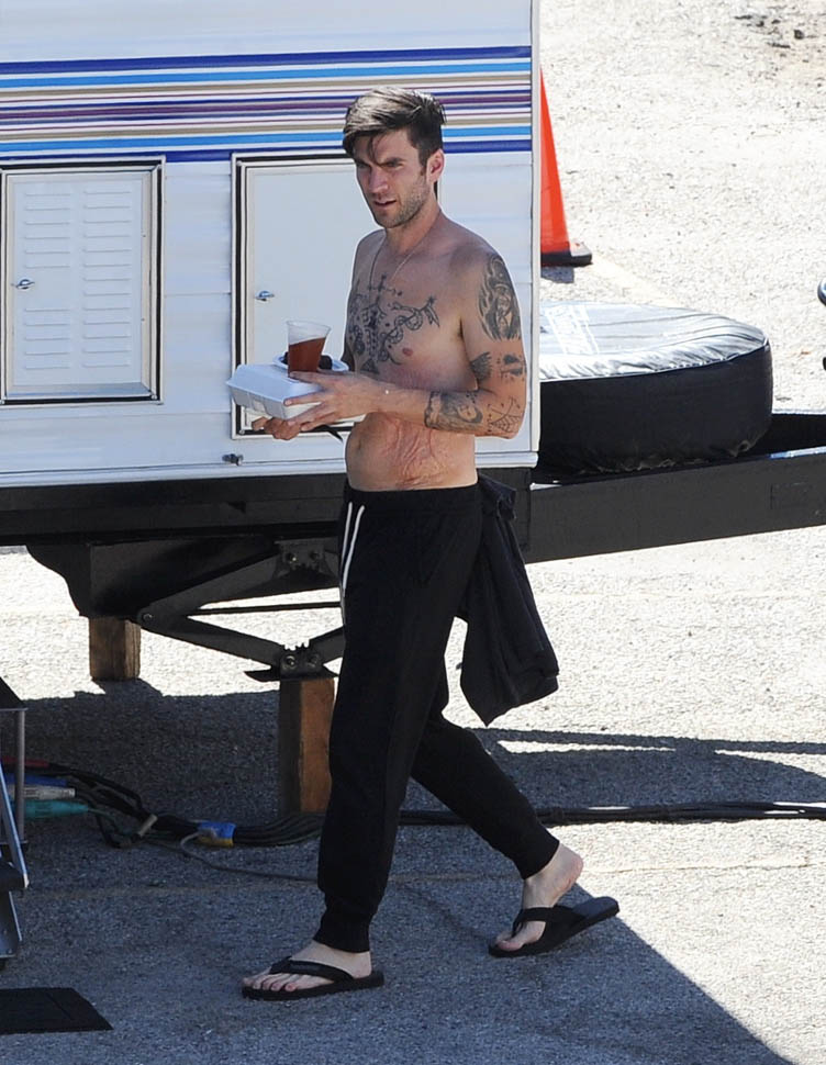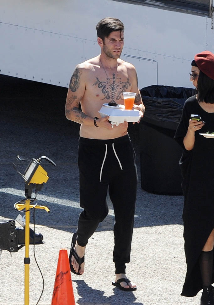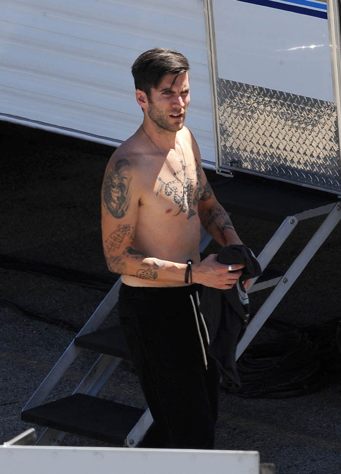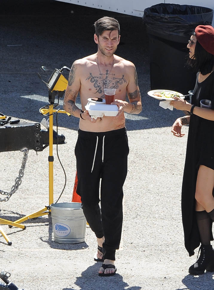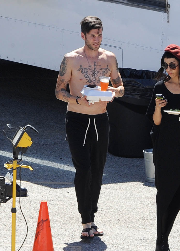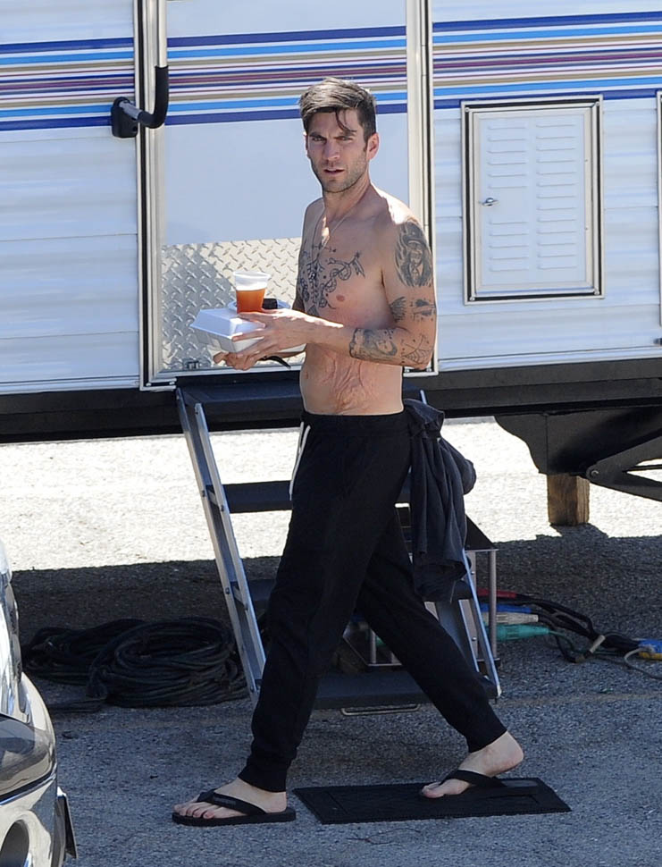 Here he is on the set of Broken Vows yesterday with his shirt off.
