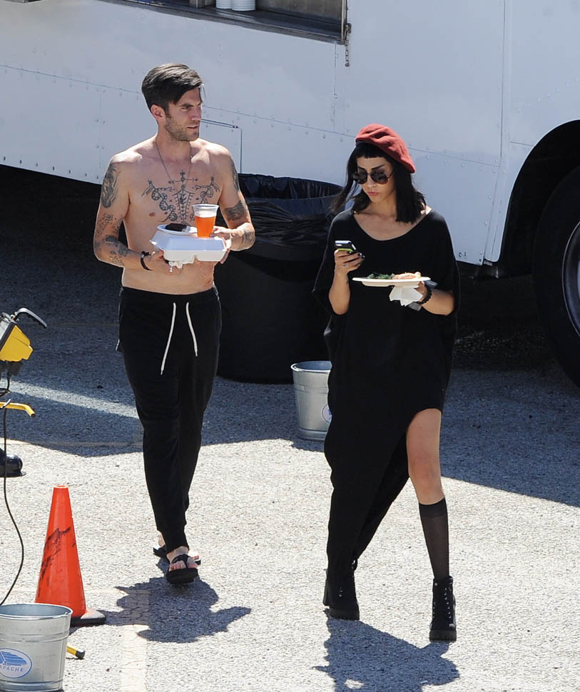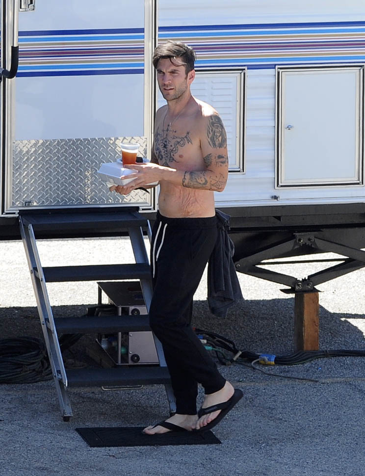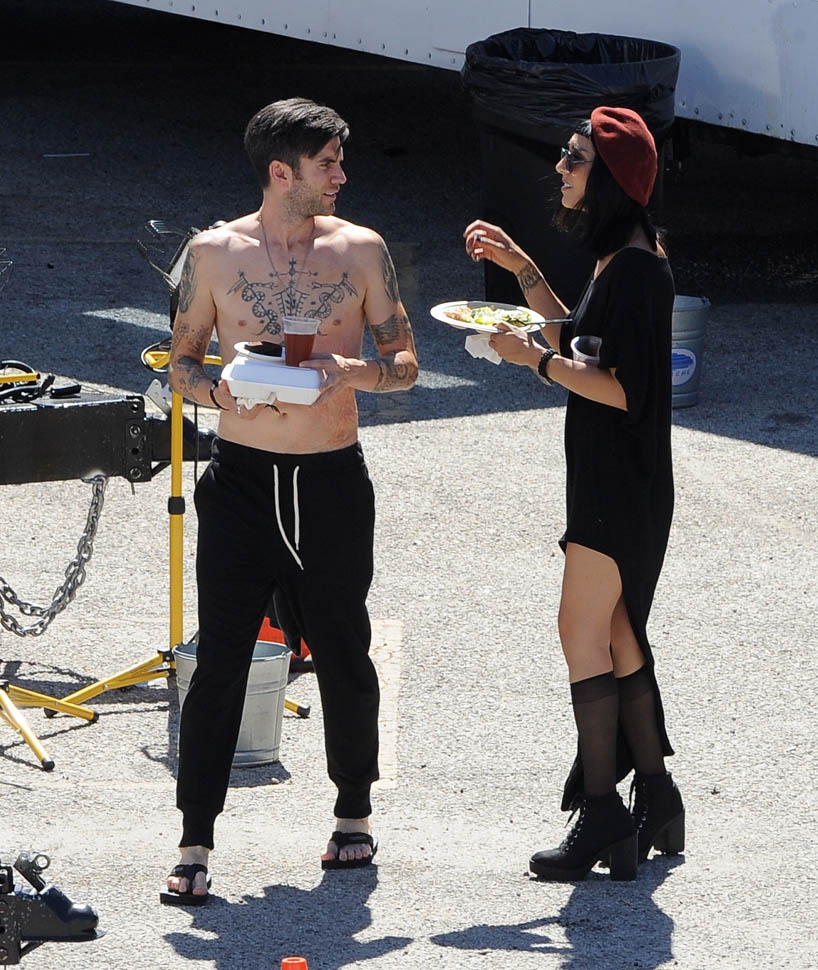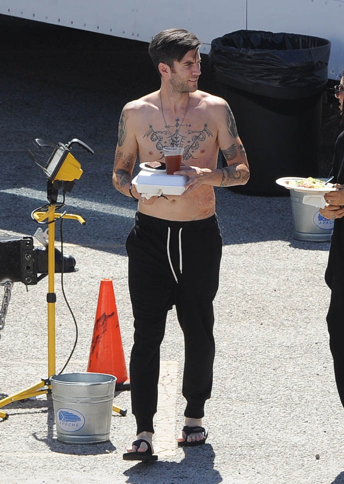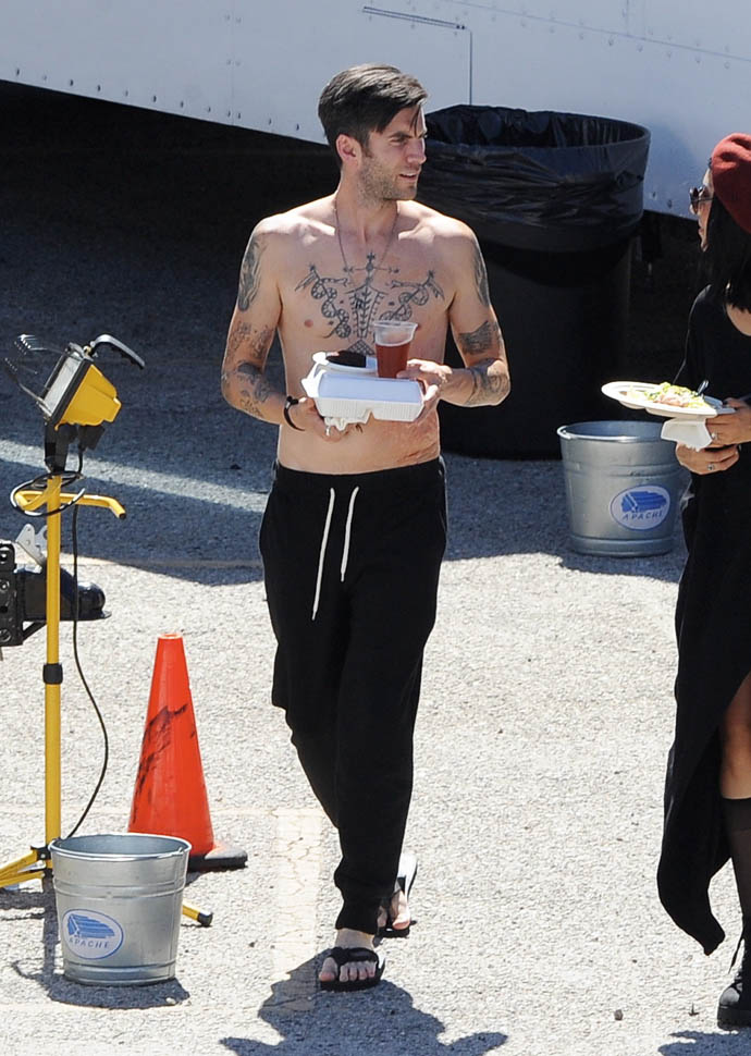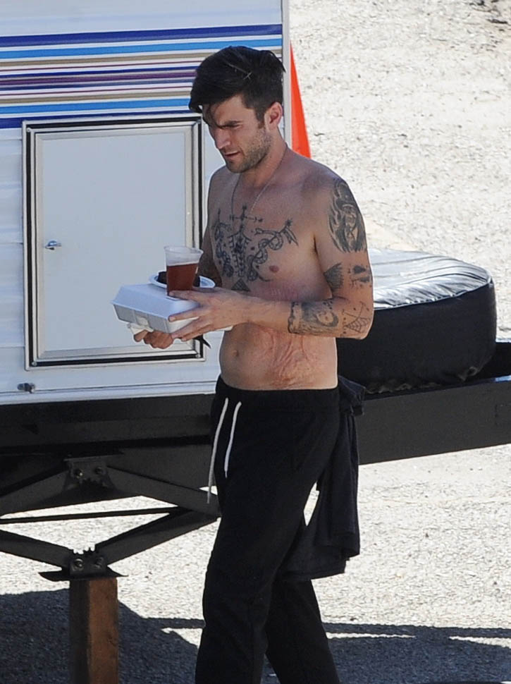 Here he is on the set of Broken Vows yesterday with his shirt off.