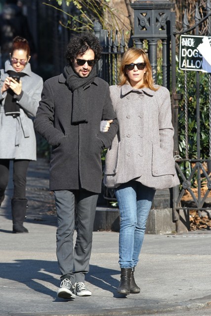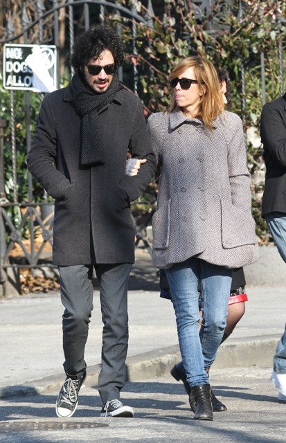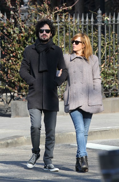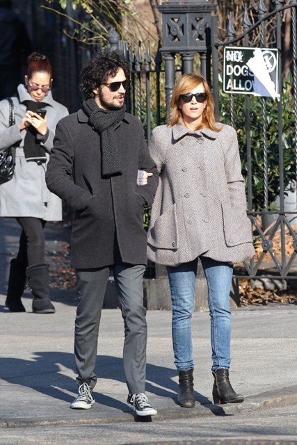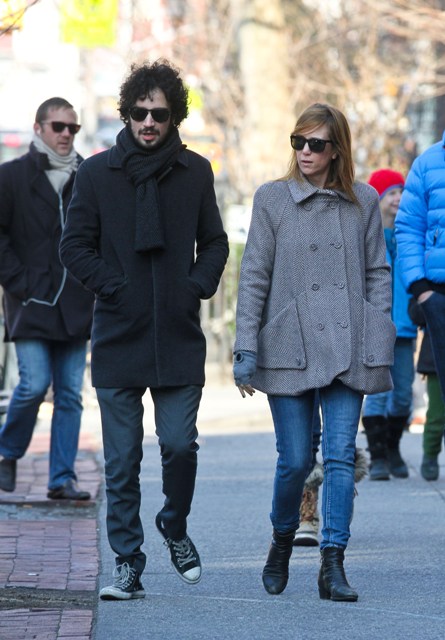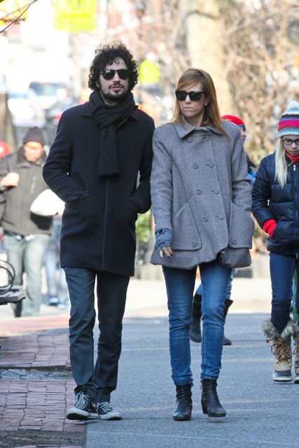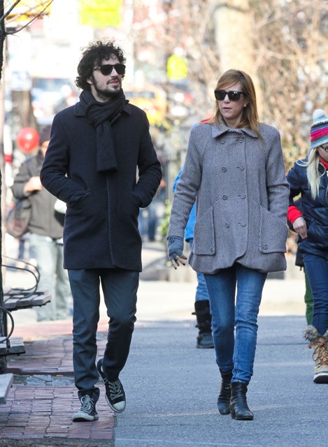 Kristen Wiig and Fabrizio Moretti hooked up towards the end of 2011. So it’s just over a year now. Here they are walking around New York on Sunday. Fabrizio’s ex-girlfriend and Kristen’s maybe ex-friend Drew Barrymore is on the cover of the current issue of ALLURE -- did you read her comments about their relationship?