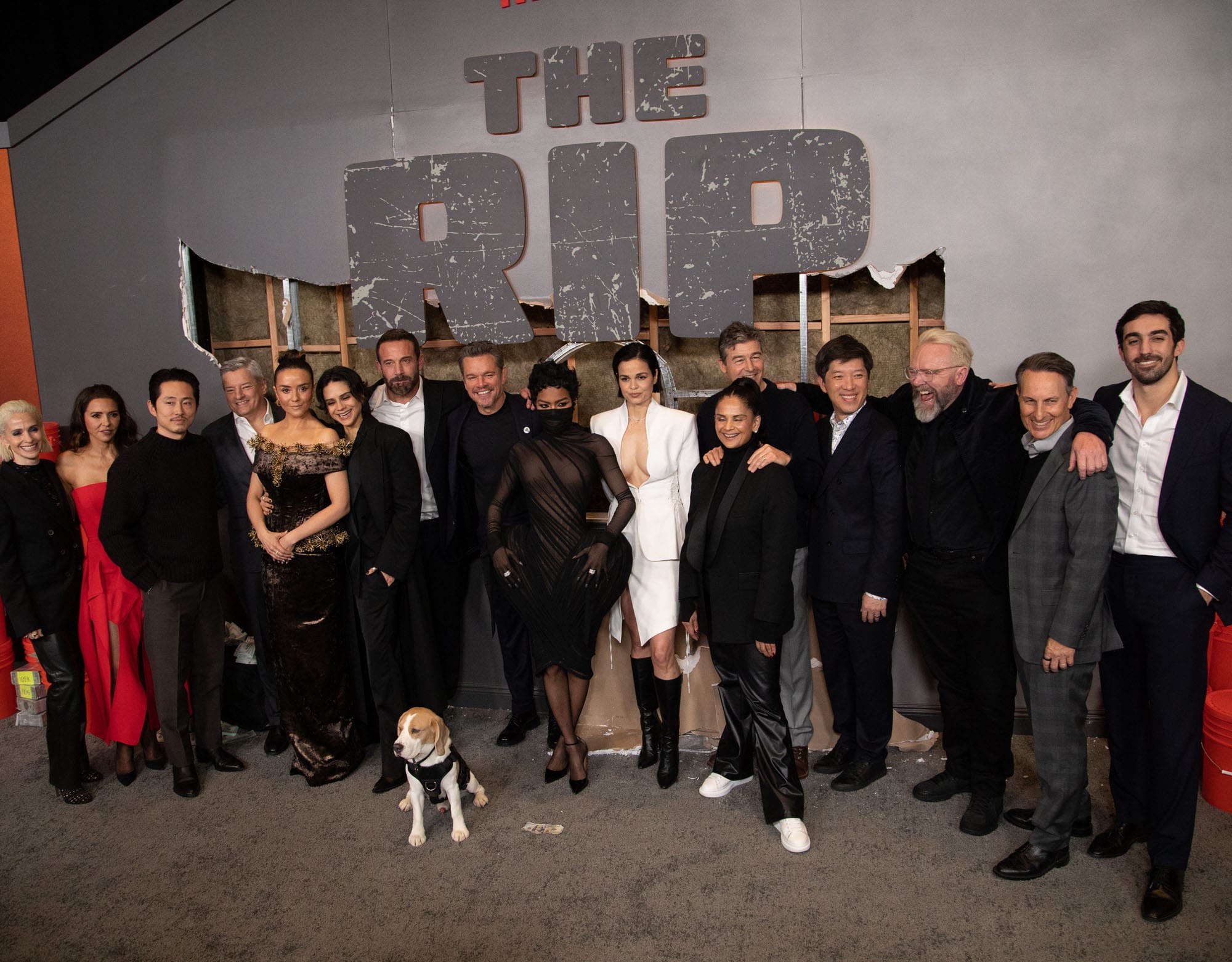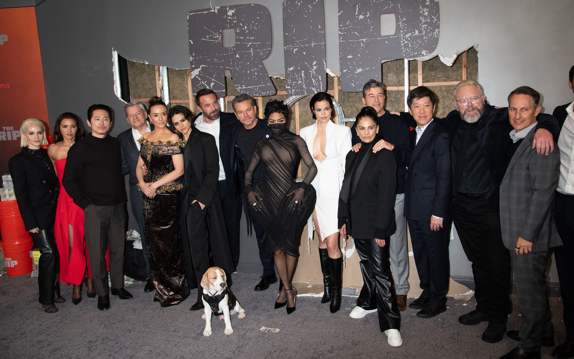 Dani Bernfeld, Luciana Barroso Damon, Steven Yeun, Ted Sarandos, Catalina Sandino Moreno, Sasha Calle, Ben Affleck, Matt Damon, Teyana Taylor, Lina Esco, Kyle Chandler, Bela Bajaria, Dan Lin, Joe Carnahan, Ori Marmur and David Kagan attend The Rip World Premiere at Alice Tully Hall on January 13, 2026 in New York City