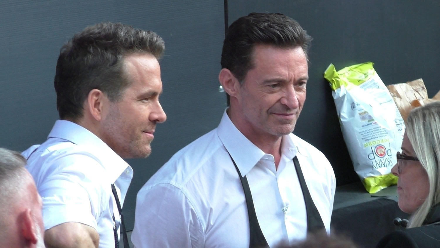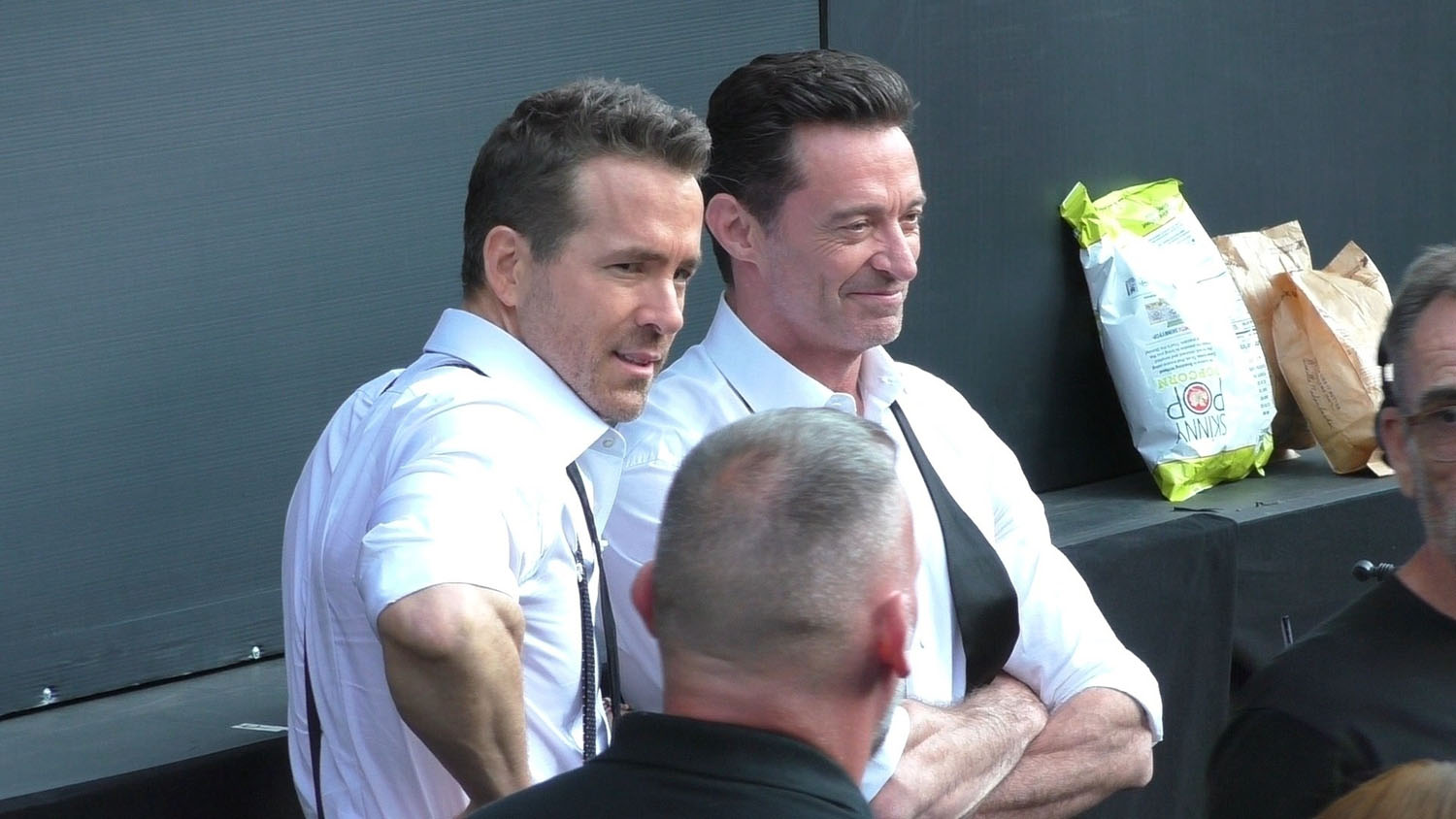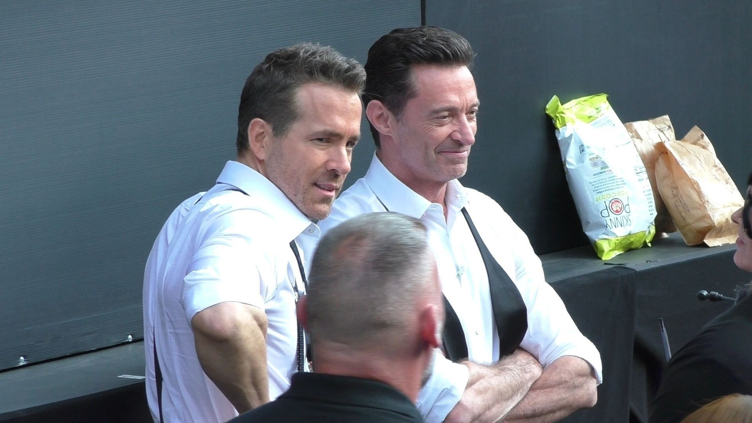Here are Deadpool & Wolverine stars Hugh Jackman, Ryan Reynolds, and Emma Corrin at Jimmy Kimmel Live! yesterday.