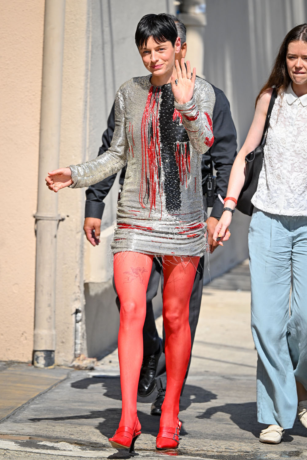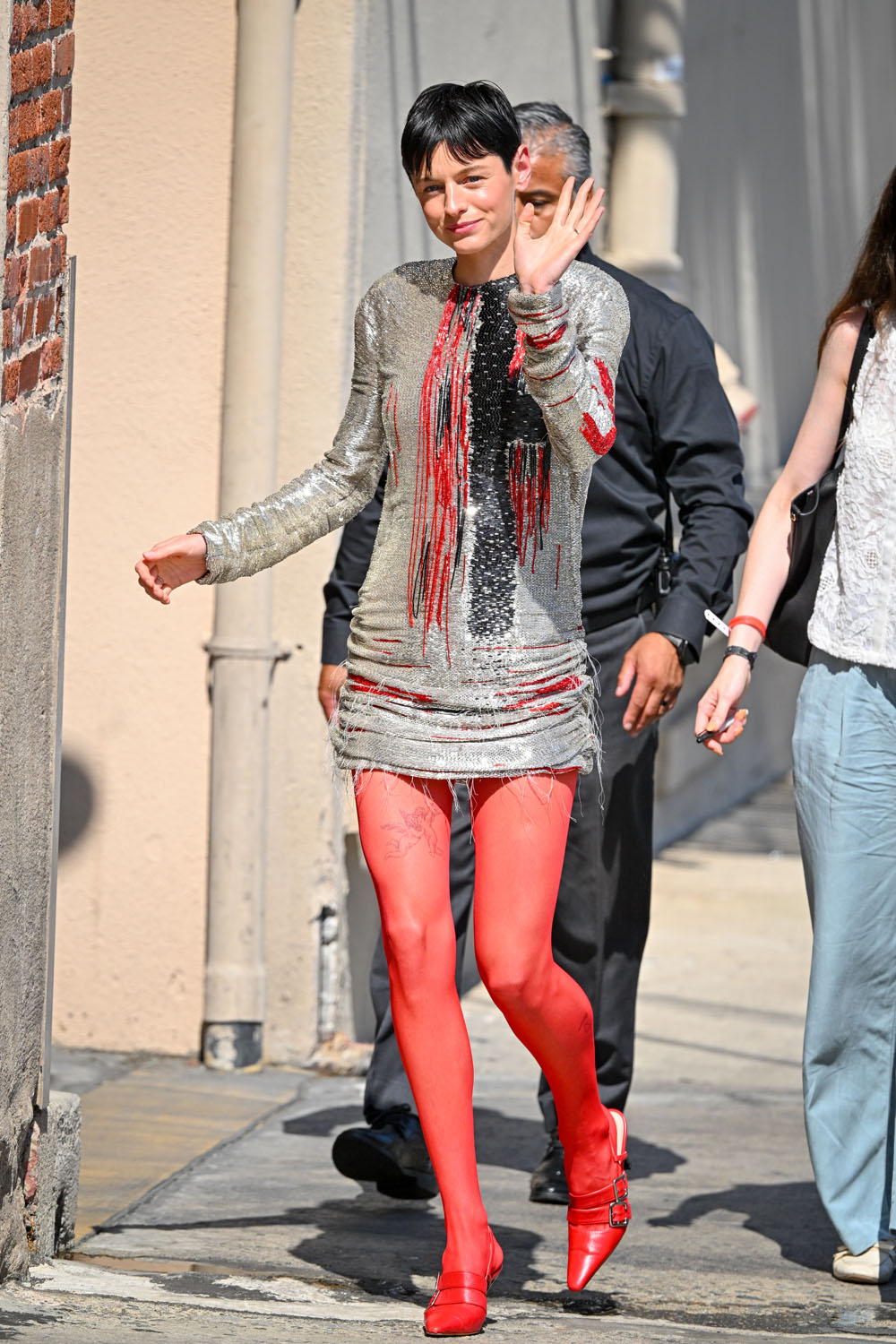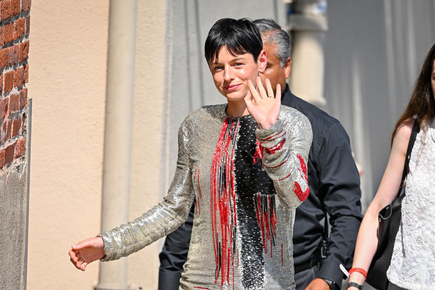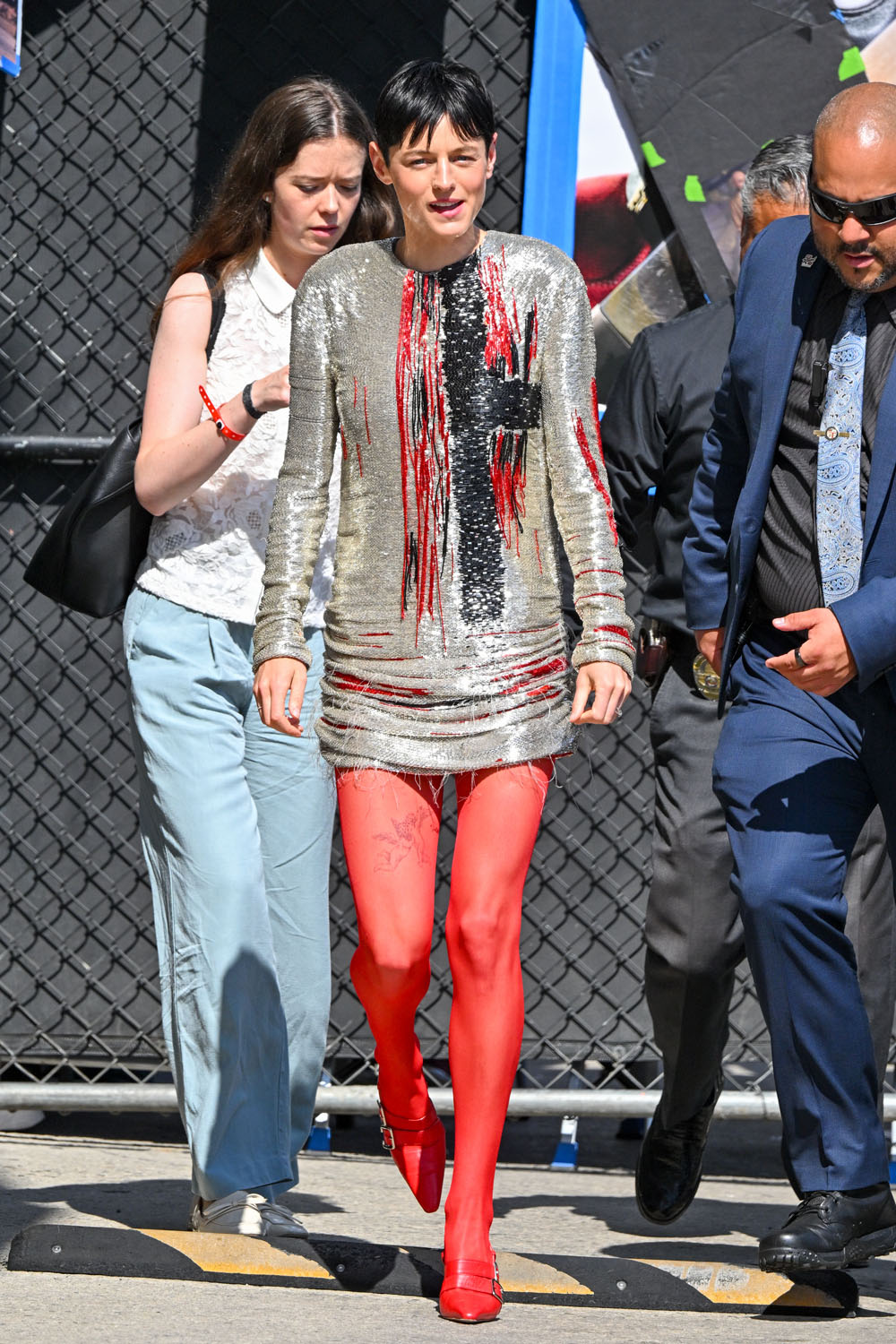 Here are Deadpool & Wolverine stars Hugh Jackman, Ryan Reynolds, and Emma Corrin at Jimmy Kimmel Live! yesterday.