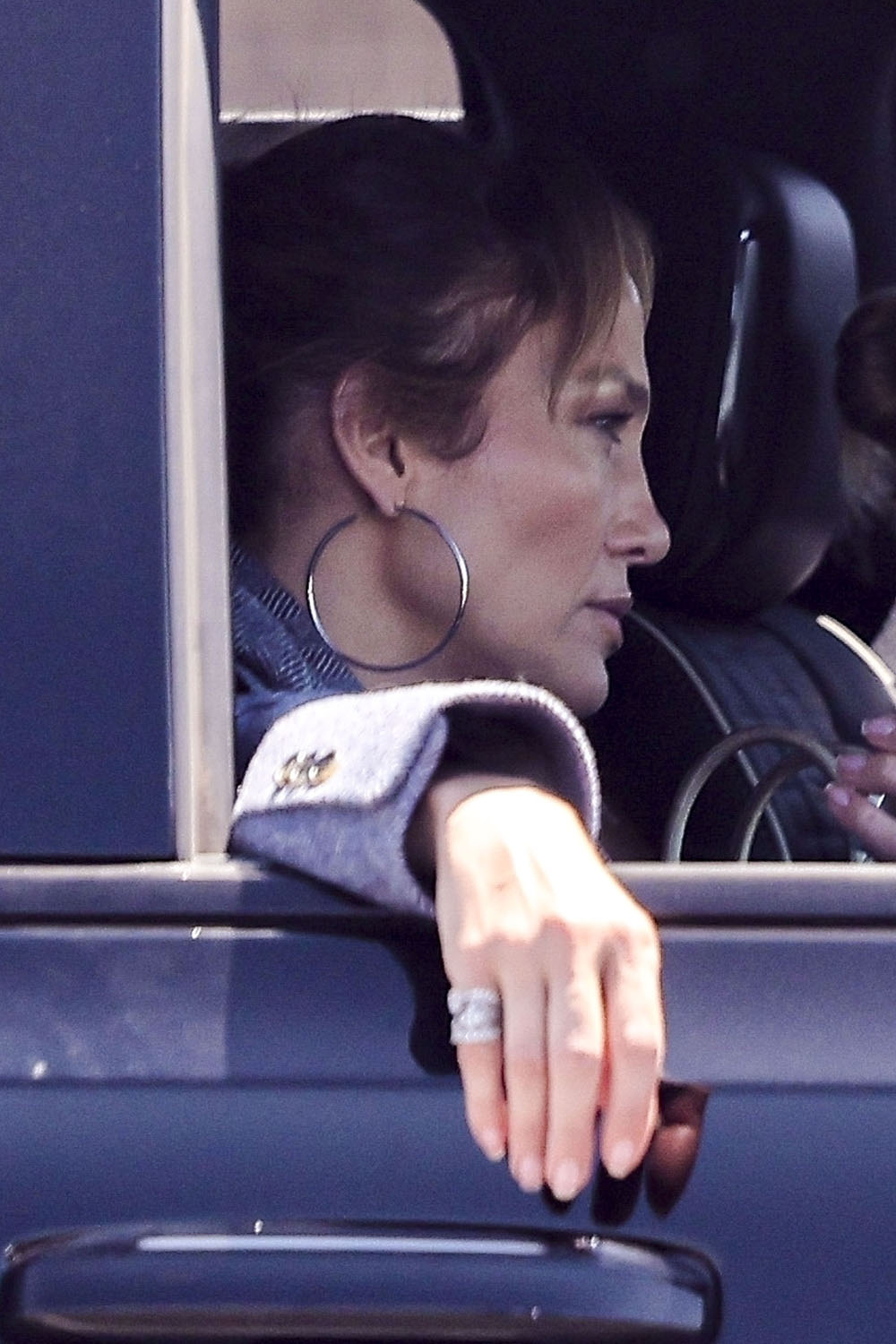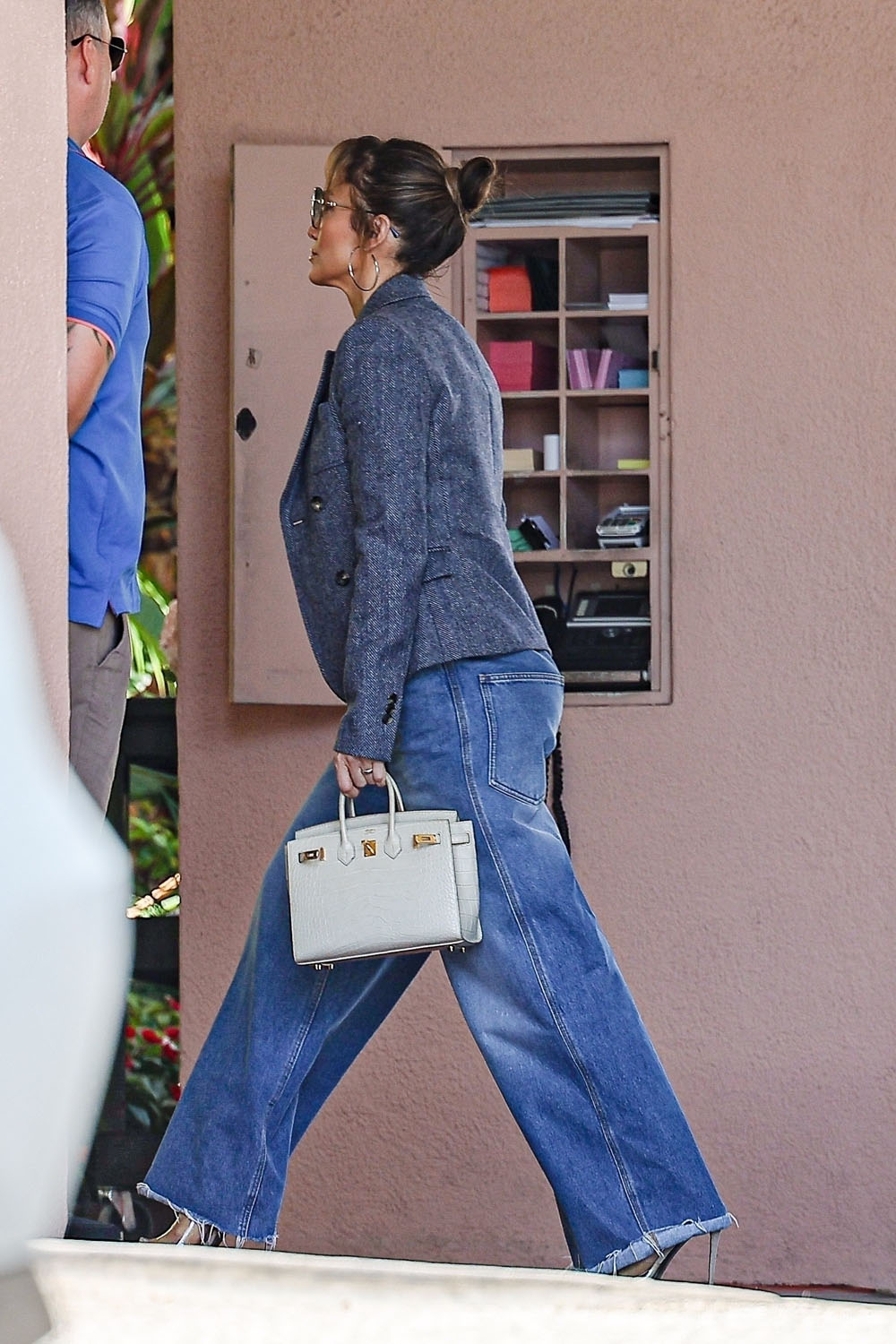 At that same lunch, Violet Affleck was apparently wearing one of JLo’s dresses, that JLo was previously seen wearing in February. And her wedding ring, which she’d taken off a few days before, was back on. It was also on on Thursday when she was photographed in a denim set that I want so much – that’s the only reason I’m talking about this. Look at the fit of the jeans with the flat front pockets, SO good.