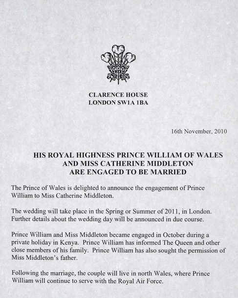 As I wrote in the open, Prince William and Kate Middleton confirmed their engagement on November 16, 2010. Exactly a week later, November 23, they confirmed their wedding date. Here’s how their official engagement announced read: