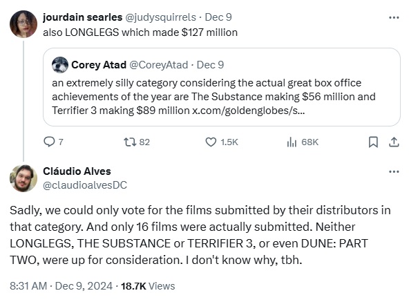 Of all the films referenced in that exchange, only Dune 2 was actually eligible for consideration. The Golden Globes’ standard for eligibility is that a film must earn a minimum of $150 million globally, with $100 million coming from the US. While The Substance, Longlegs, and Terrifier 3 are all low-budget success stories, none of them topped the minimum earning bar for the Globes. And Dune 2, which did earn enough for consideration, was withheld because apparently someone involved with that film has the good sense to be embarrassed by a “popular Golden Globe” award, unlike anyone involved with the Golden Globes.