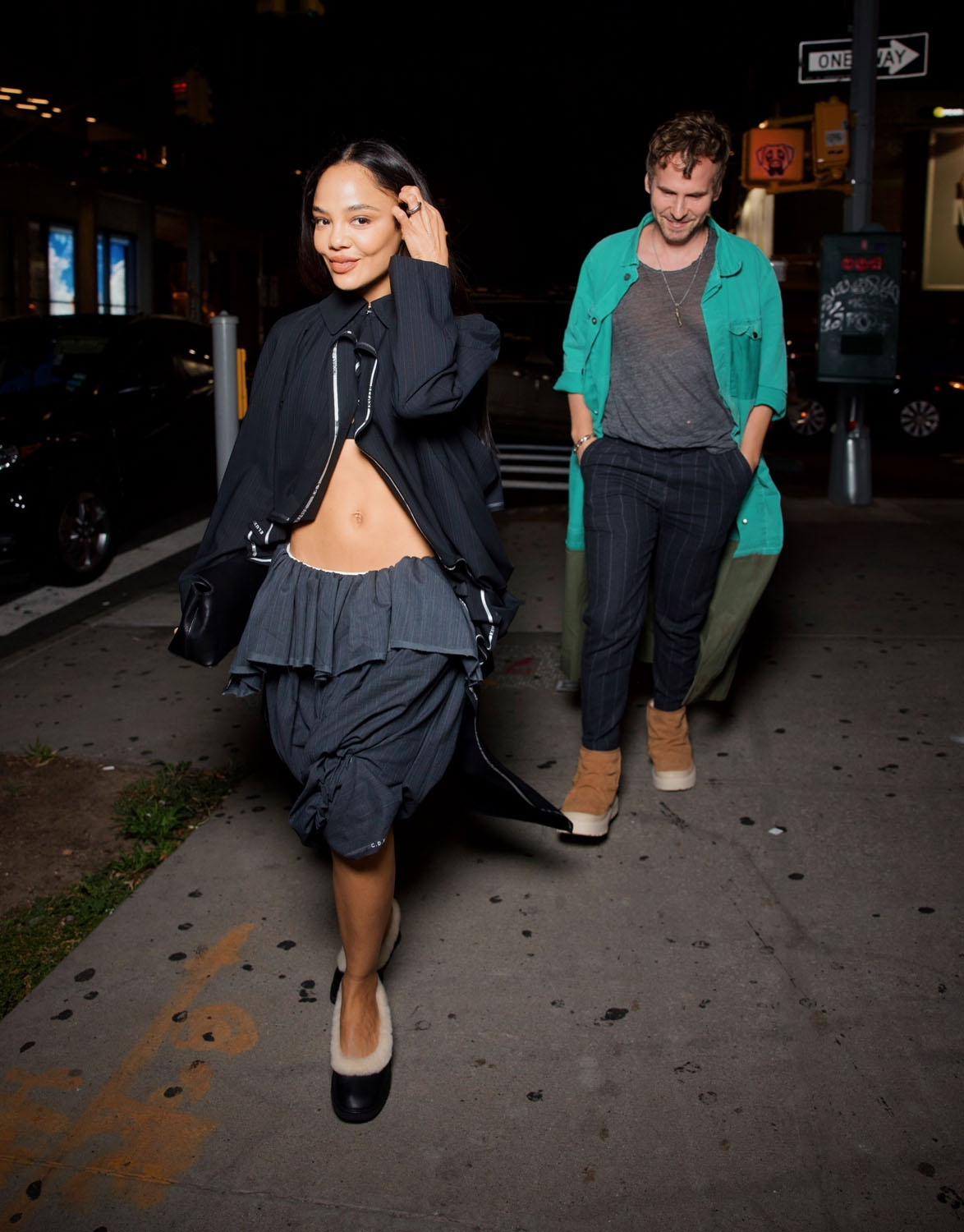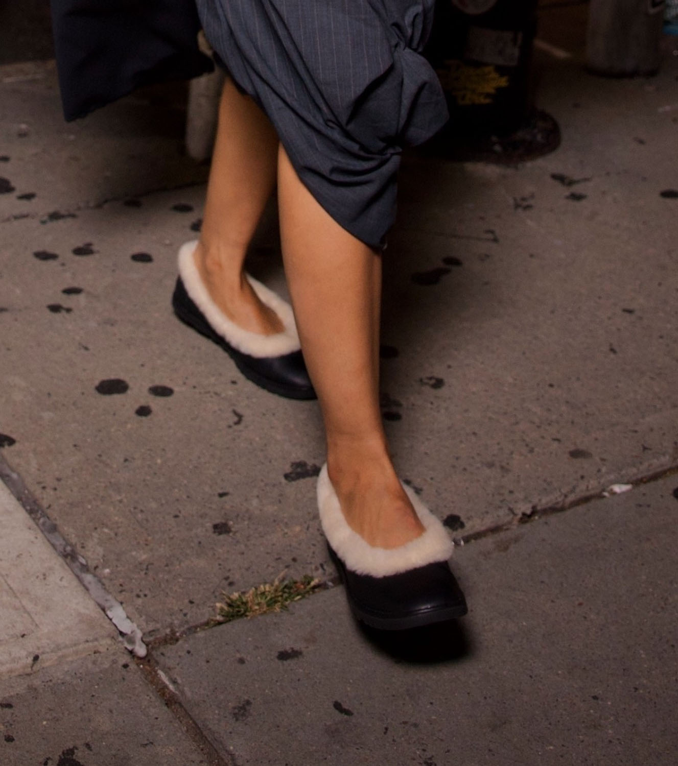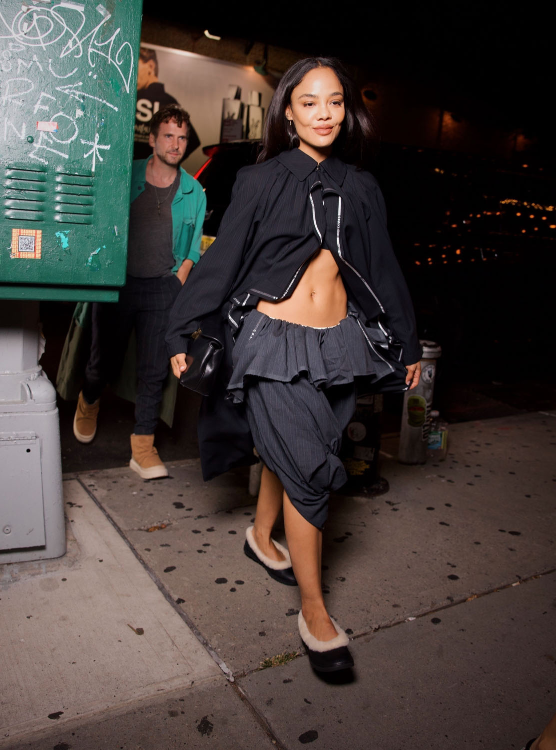 Tessa rocked a flouncy parachute skirt…shorts?...skort??...and bare abs for date night. She looks incredible of course, that face card never declines, neither does the ab card, but what I really want to talk about are her shoes. Tessa was seen leaving her hotel in a pair of open-toed heels but then was photographed in a pair of fleece-lined ballet flats—much more sensible shoes. She was on her way to the UGG Season Party, so I assume the flats are UGGs.