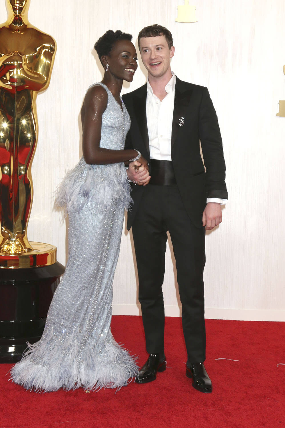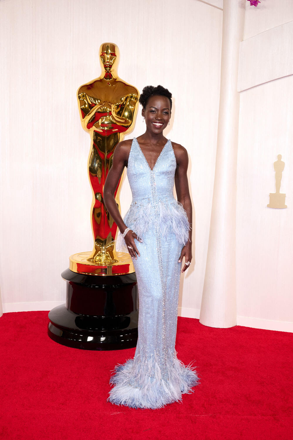 Oscars fashion controversy! Lupita Nyong’o wore a custom Armani Prive gown to the 2024 Oscars with a feathered peplum and hem, which was 1) a dress originally designed for 2020 but Lupita ended up hanging onto it till now and 2) supposedly a “tribute” to her iconic 2014 Oscar dress in which she won Best Supporting Actress.