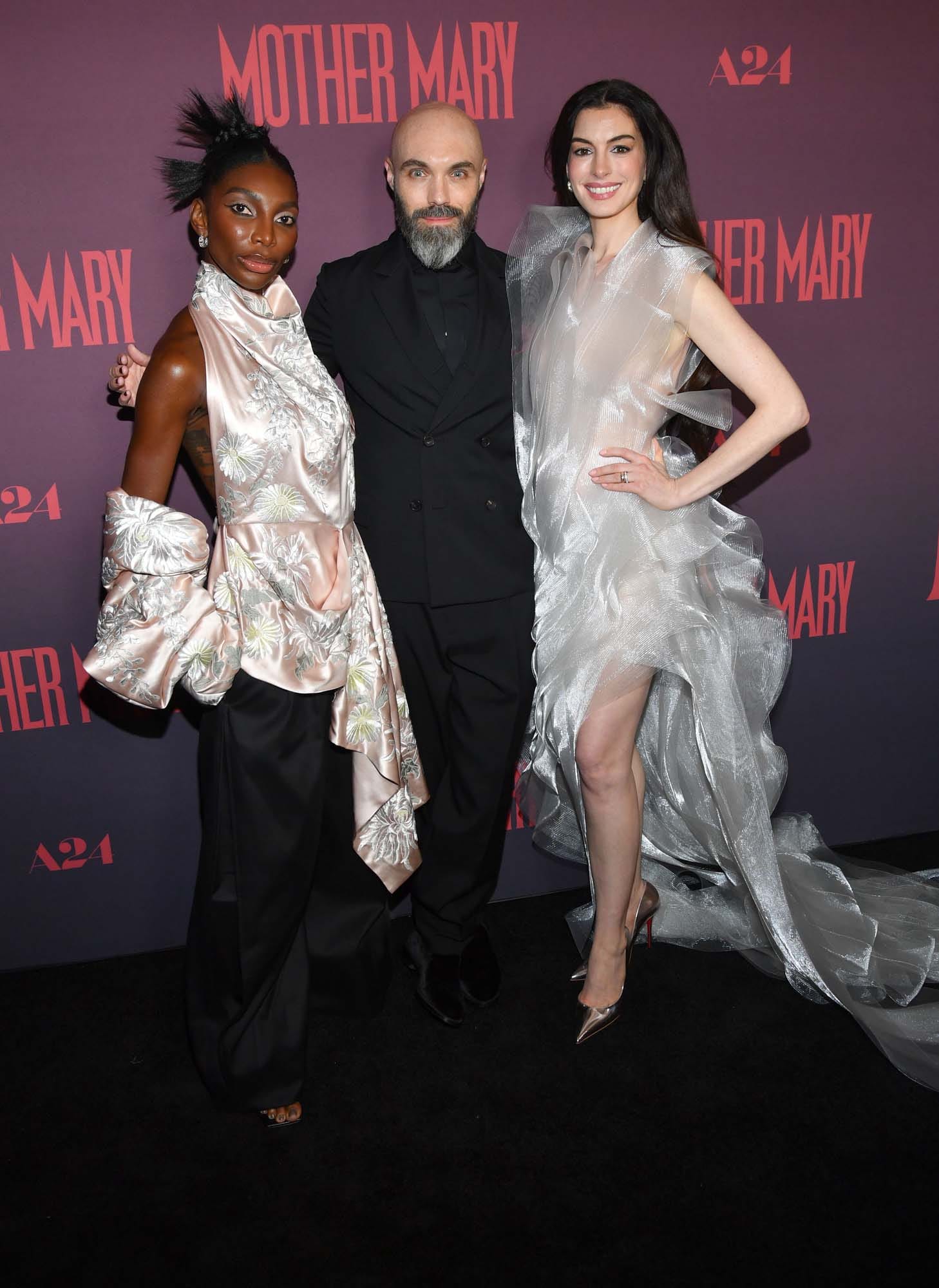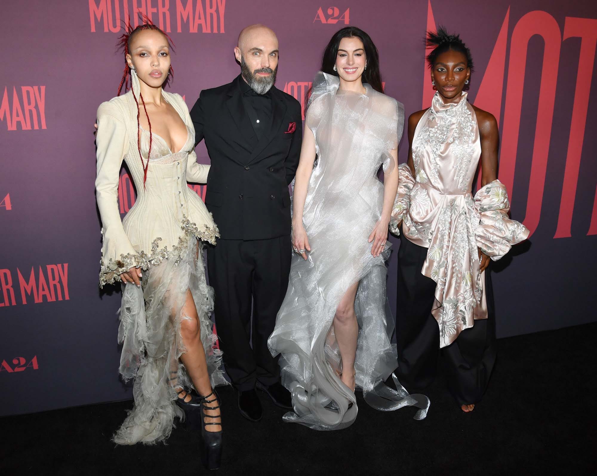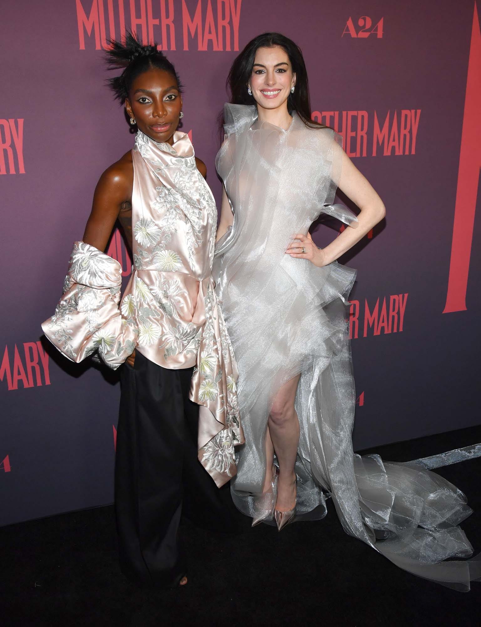 After taking The Devil Wears Prada 2 press tour through East Asia last week, Anne Hathaway was back in New York last night, redirecting her attention to Mother Mary. She plays a popstar kinda like Lady Gaga, with performance footage in the film that is said to have been inspired by Taylor Swift’s The Eras Tour. The problem is that Mother Mary is in a slump, and she needs her ex-best friend, Michaela Coel, to make her a dress so that she can perform the greatest show of her life. The film, then, is basically the two women working out their sh-t. That’s as much as we know from the trailer.