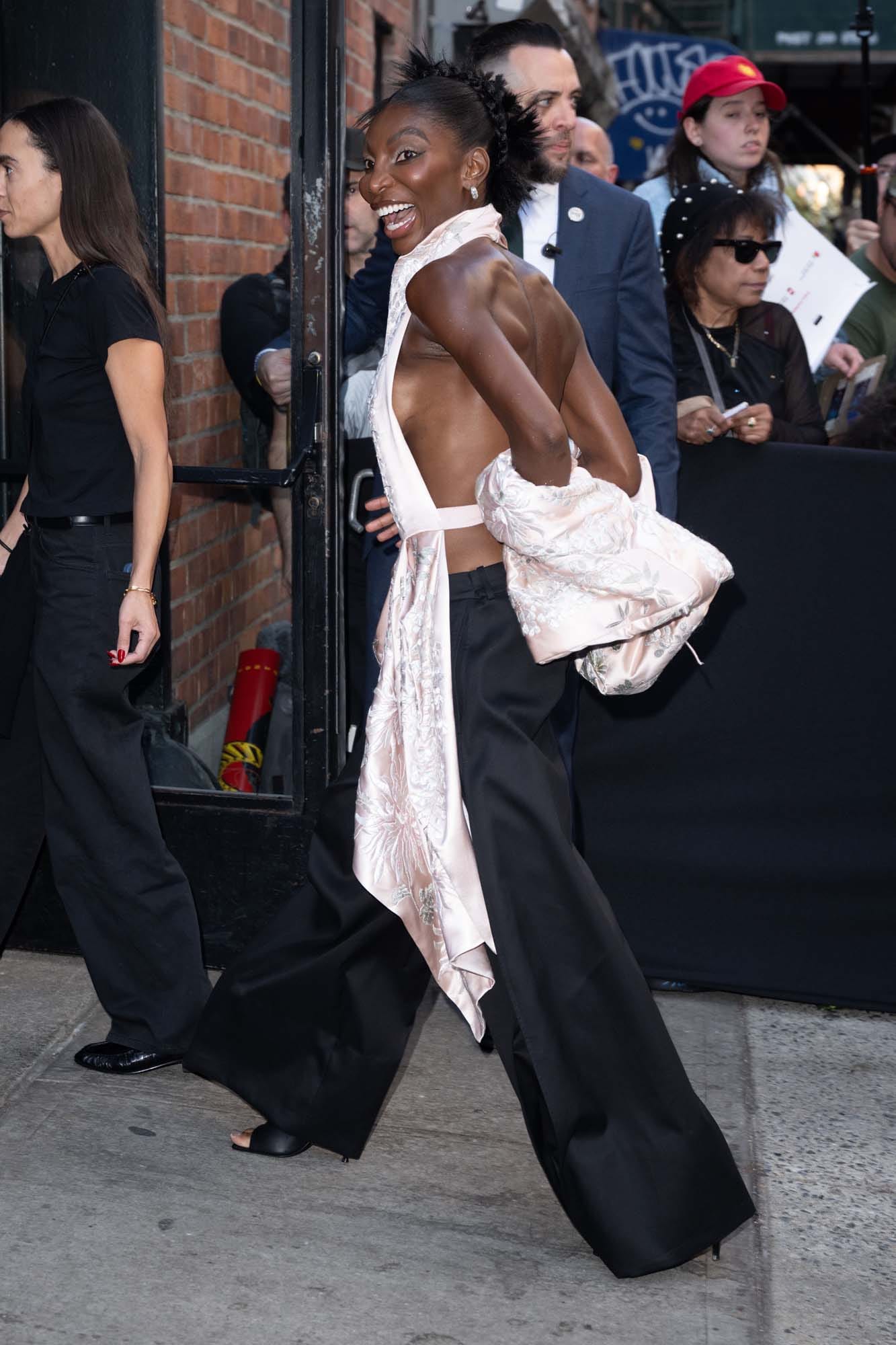 For now though, let’s preoccupy ourselves with the fashion the red carpet. Michaela Coel is in Givenchy, black pants under a satin halter with half-sleeves. I like the swing she’s taking here, opting for a look that her character (a fashion designer) might wear even though it doesn’t quite pop at this event the way it did on the runway.