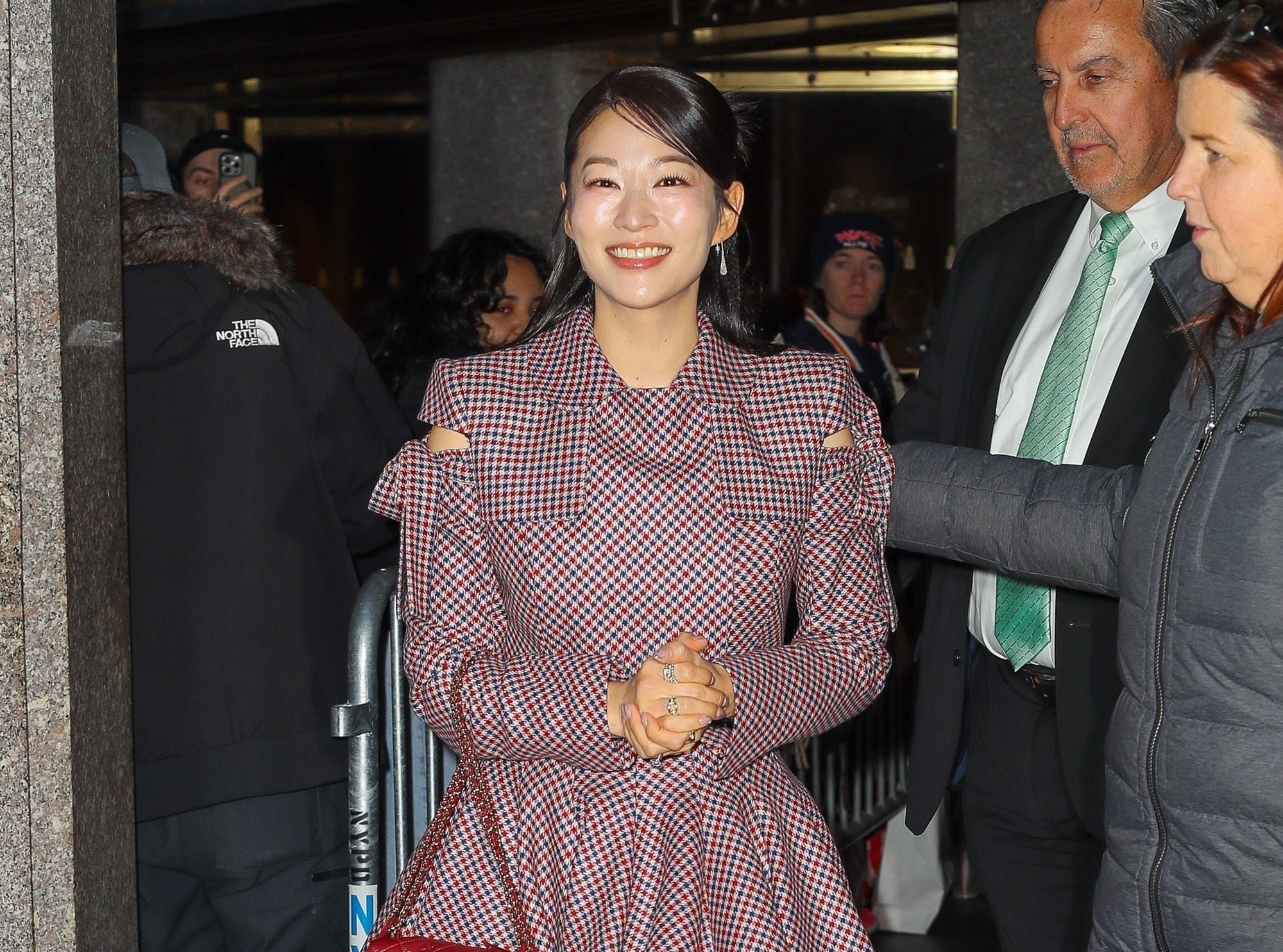 As for Arden Cho, she wore a SUPER cute houndstooth outfit coming out of NBC Studios. I mostly just want to include this spectacularly cute ensemble. As she, the speaking voice of Huntr/x member Rumi, was on the east coast, EJAE and the singing members of Huntr/x were on the west coast, performing on Jimmy Kimmel Live!. The Golden Globes are Sunday, KPop Demon Hunters is nominated three times, and they should win a couple of trophies (animated film and original song). The KDPH trophy train is leaving the station!