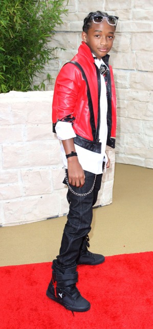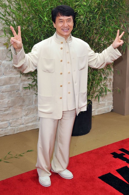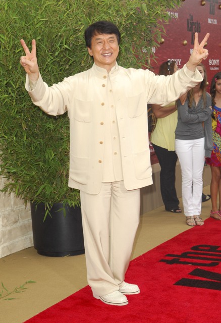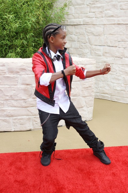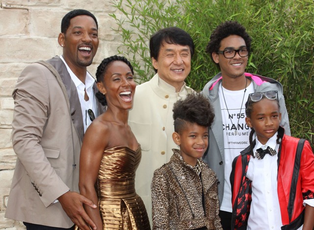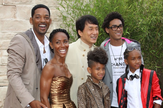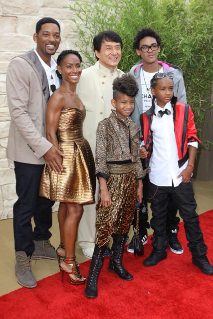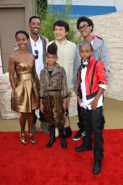 The new Karate Kid is Jaden Smith. Son of Will and Jada. So of course the entire Family Smith showed up to support yesterday at the LA premiere. Jackie Chan and his male Hello Kitty peace signs make my life.