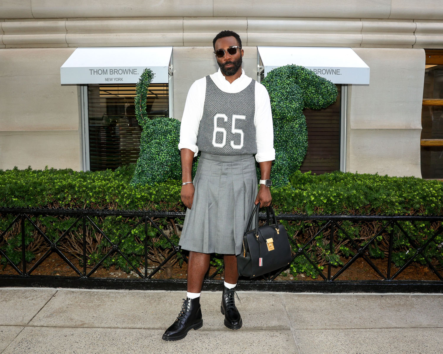 But he can also do it in a skirt and a mesh tank in Thom Browne: