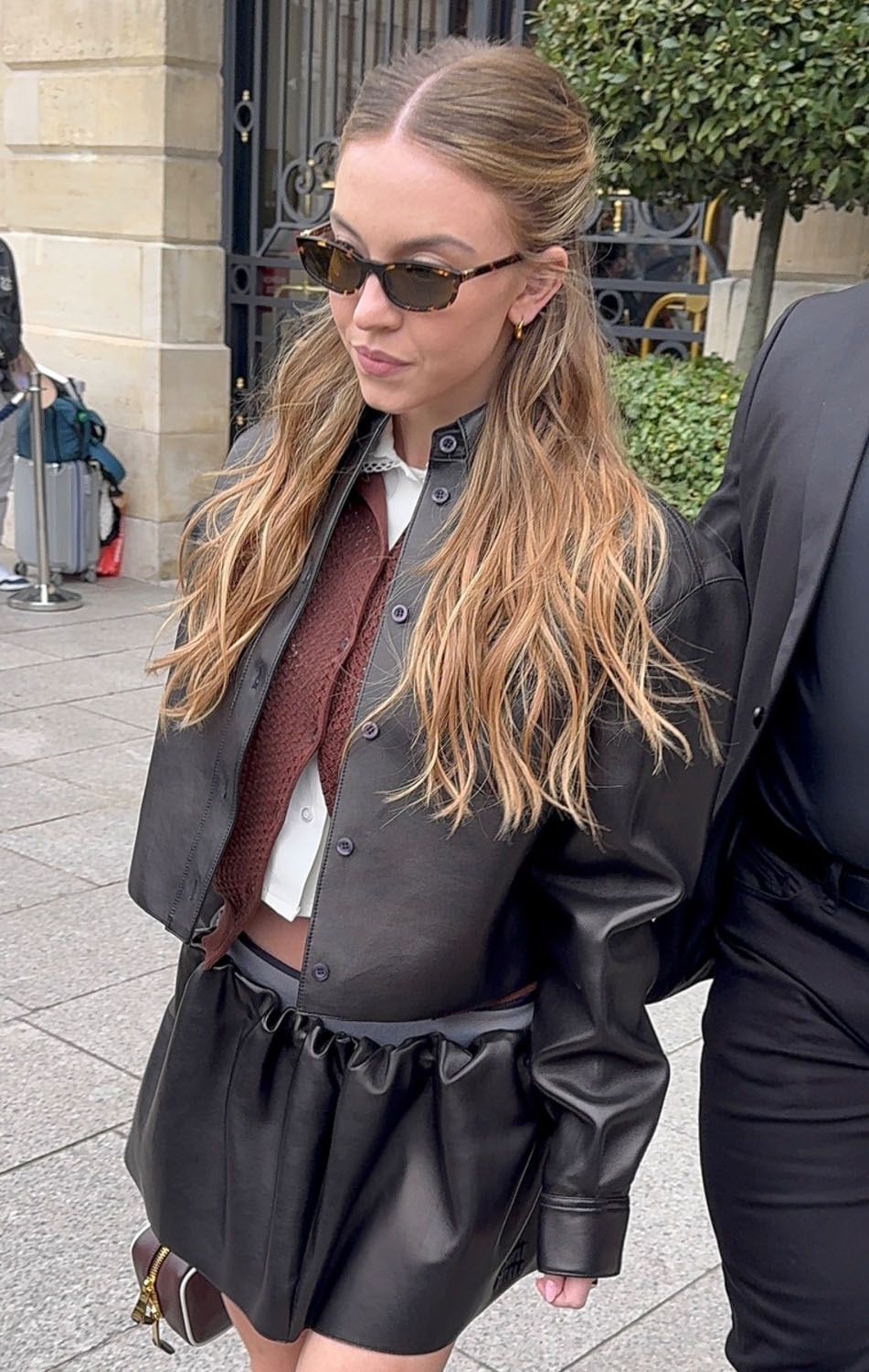 Sydney Sweeney is at Paris Fashion Week since she’s one of Miu Miu’s ambassadors. She arrived at the show in a fit that is super Miu Miu coded – leather jacket and short loose pleated skirt, socks, and pumps.