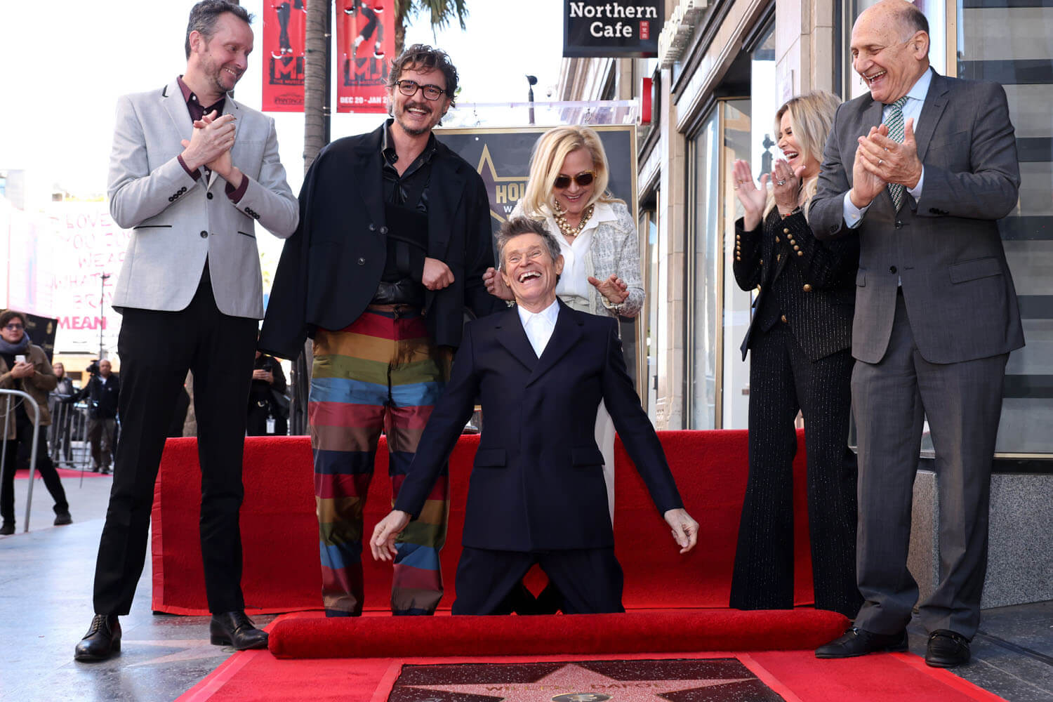 His induction ceremony drew a real random-ass crowd, from some of his oldest filmmaker friends like Wim Wenders and Walter Hill, to more recent filmmaker friends like Sean Baker—Dafoe was nominated for an Oscar in Baker’s film, The Florida Project—as well as Patricia Arquette, who directs Dafoe in her upcoming feature directorial debut, Gonzo Girl. Dafoe’s Gonzo Girl co-star, Camila Morrone, was also on hand, as was his Poor Things co-star, Mark Ruffalo, and…Pedro Pascal.